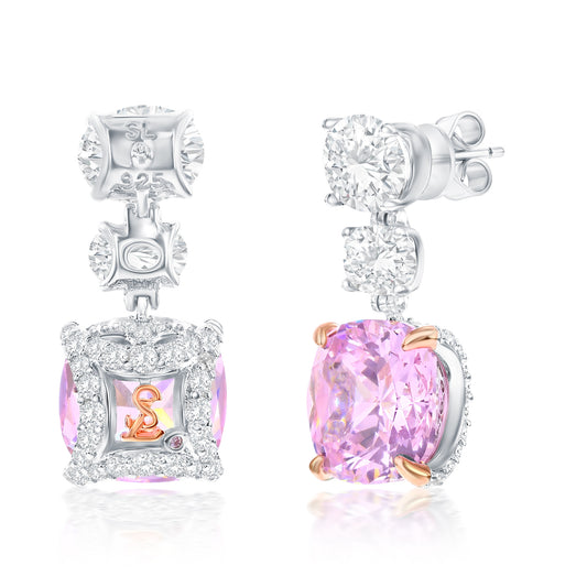 Suzy Levian Sterling Silver Gala Firework Cushion Cut Pink & Oval White Cubic Zirconia Drop Earrings