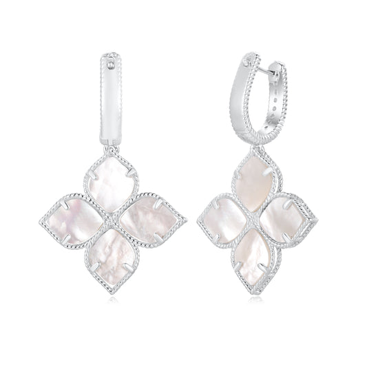 Suzy Levian Sterling Silver Mother of Pearl White Cubic Zirconia Pave Flower Clover Hanging Earrings