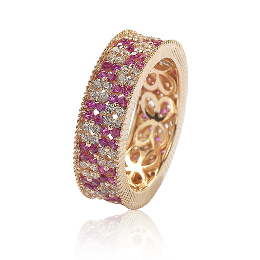 Suzy Levian Rose Sterling Silver Ruby and White Cubic Zirconia Floral Eternity Band
