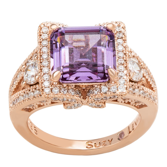 Suzy Levian Rose Sterling Silver Purple Square Ascher Cut Cubic Zirconia Engagement Ring