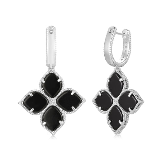 Suzy Levian Sterling Silver Black Enamel White Cubic Zirconia Pave Flower Clover Hanging Earrings