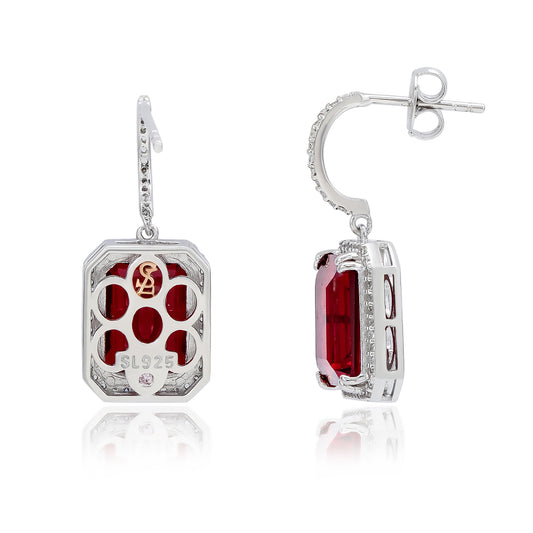 Suzy Levian White Sterling Silver Emerald Cut Red White Cubic Zirconia Halo Dangling Earrings