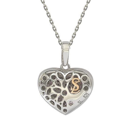 Suzy Levian Pink Sapphire Rose Sterling Silver Pave Heart Pendant