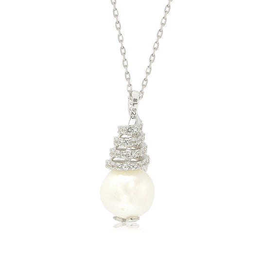 Suzy Levian Sterling Silver Pearl & White Sapphire Swirl Pendant