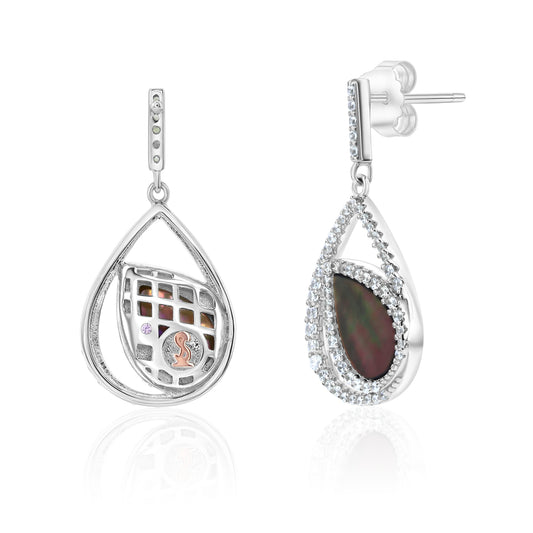 Suzy Levian Sterling Silver White Cubic Zirconia Double Teardrop Black Mother of Pearl Dangle Earrings