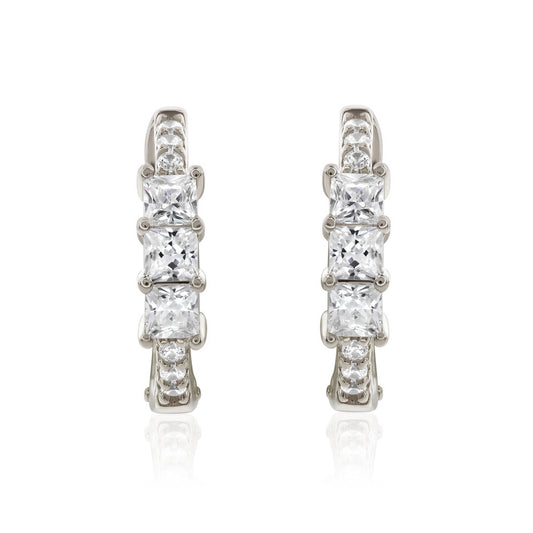 Suzy Levian White Sterling Silver & White Cubic Zirconia Pave Princess Cut Huggie Hoop Earrings