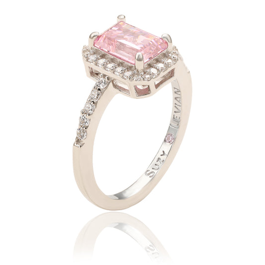 Suzy Levian Sterling Silver Emerald Cut Pink Sapphire & Diamond Accent Halo Ring