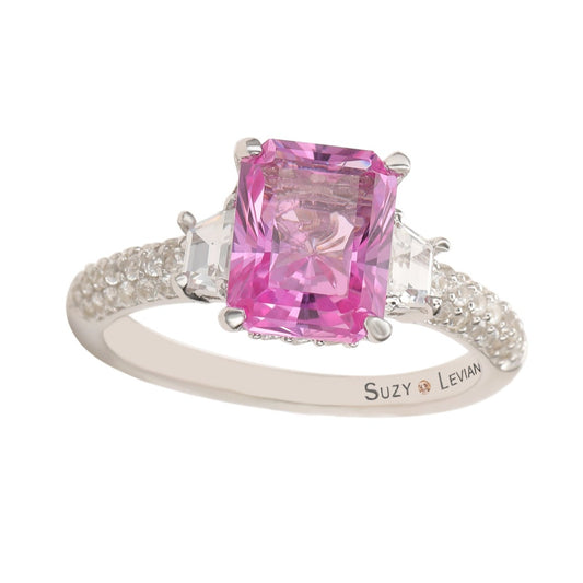 Suzy Levian Sterling Silver Pink Sapphire & Diamond Accent 3cttw Emerald Cut Bridal Ring