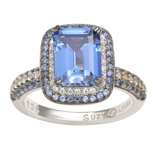 Suzy Levian Sterling Silver Emerald Cut Blue Sapphire & Diamond Accent Halo Ring