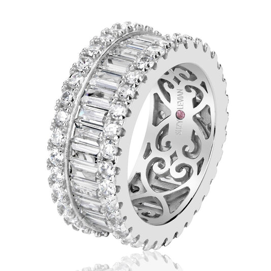 Suzy Levian Rose Sterling Silver Cubic Zirconia White Baguette and Round Wide Eternity Band