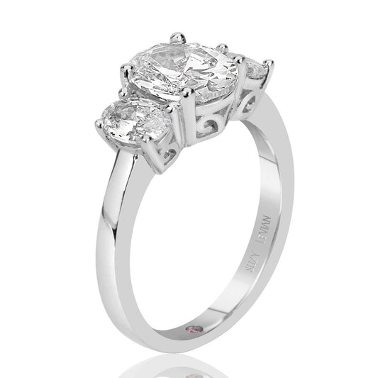 Suzy Levian Sterling Silver White Oval Cut Cubic Zirconia 3-Stone Engagement Ring