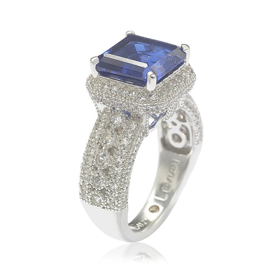Suzy Levian Sterling Silver Emerald-Cut Sapphire & Diamond Accent Ring with 18k Gold Logo