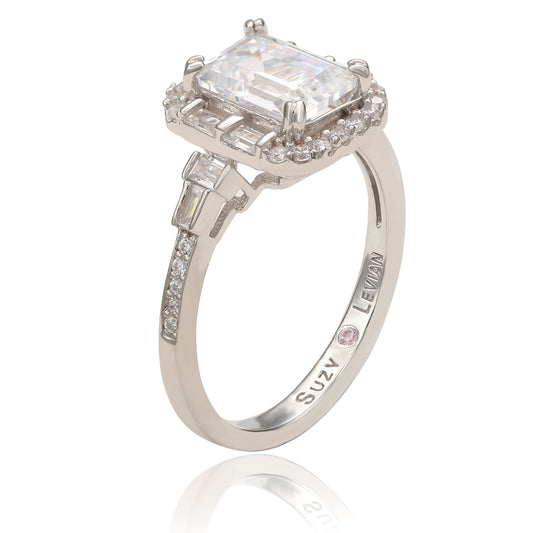 Suzy Levian Sterling Silver Emerald Cut White Cubic Zirconia Engagement Ring