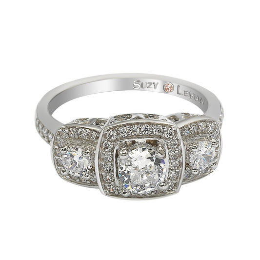 Suzy Levian Sterling Silver Cubic Zirconia White Three Stones Halo Engagement Ring