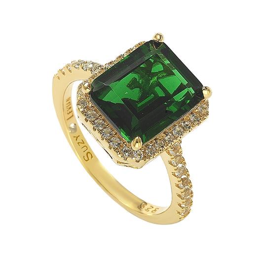 Suzy Levian Golden Sterling Silver Large Emerald-Cut Green and White Cubic Zirconia Halo Ring