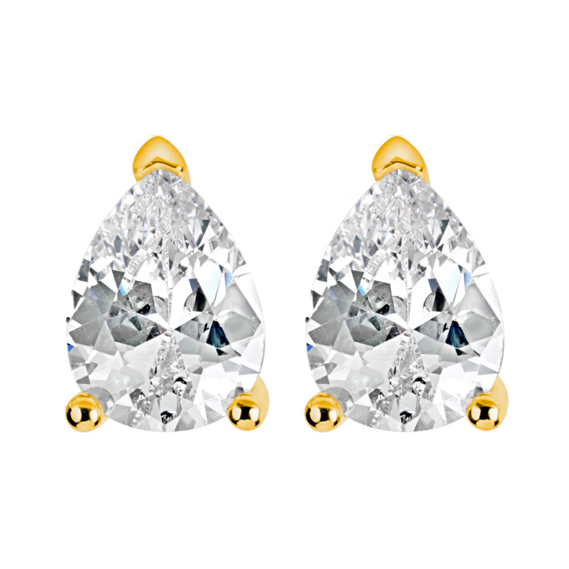 | Indulge in this timeless pair of Suzy Levian modern stud earrings! Your jewelry closet deserves it! Two beautiful, high-quality, pear shape-cut white cubic zirconia are the center of attention of these prong-set earring studs. These match pair studs measure 7.7mm x 5.7 mm and are 1 ct weight each stone. These studs are set in a yellow sterling silver setting for a high polished look. These earrings secure with a butterfly closure. |