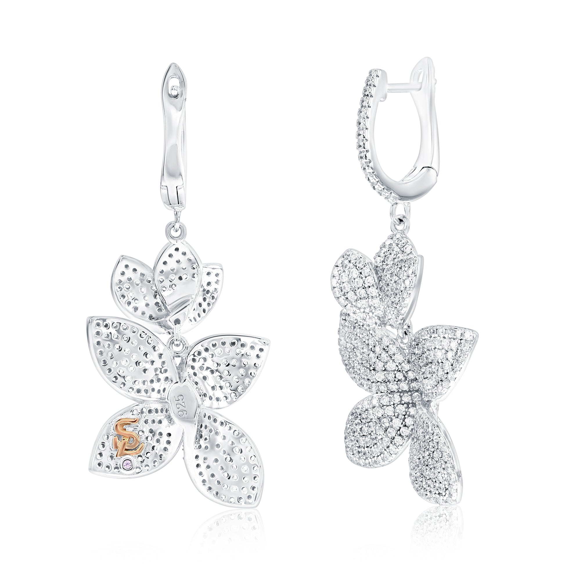 These gorgeous Suzy Levian earrings feature timeless beauty in a breathtaking design. These earrings feature large abstract flower drop design of white pave round cubic zirconia gemstones which are set in sterling silver with a high polish finish for extra shine. These earrings are perfect for all occasions. These earrings were created with a message. By creating jewelry that is beautiful inside and out, Suzy Levian sets an rose SL logo along with a secret stone, at the back of earring to inspire women to let their beauty shine from bottom to top.