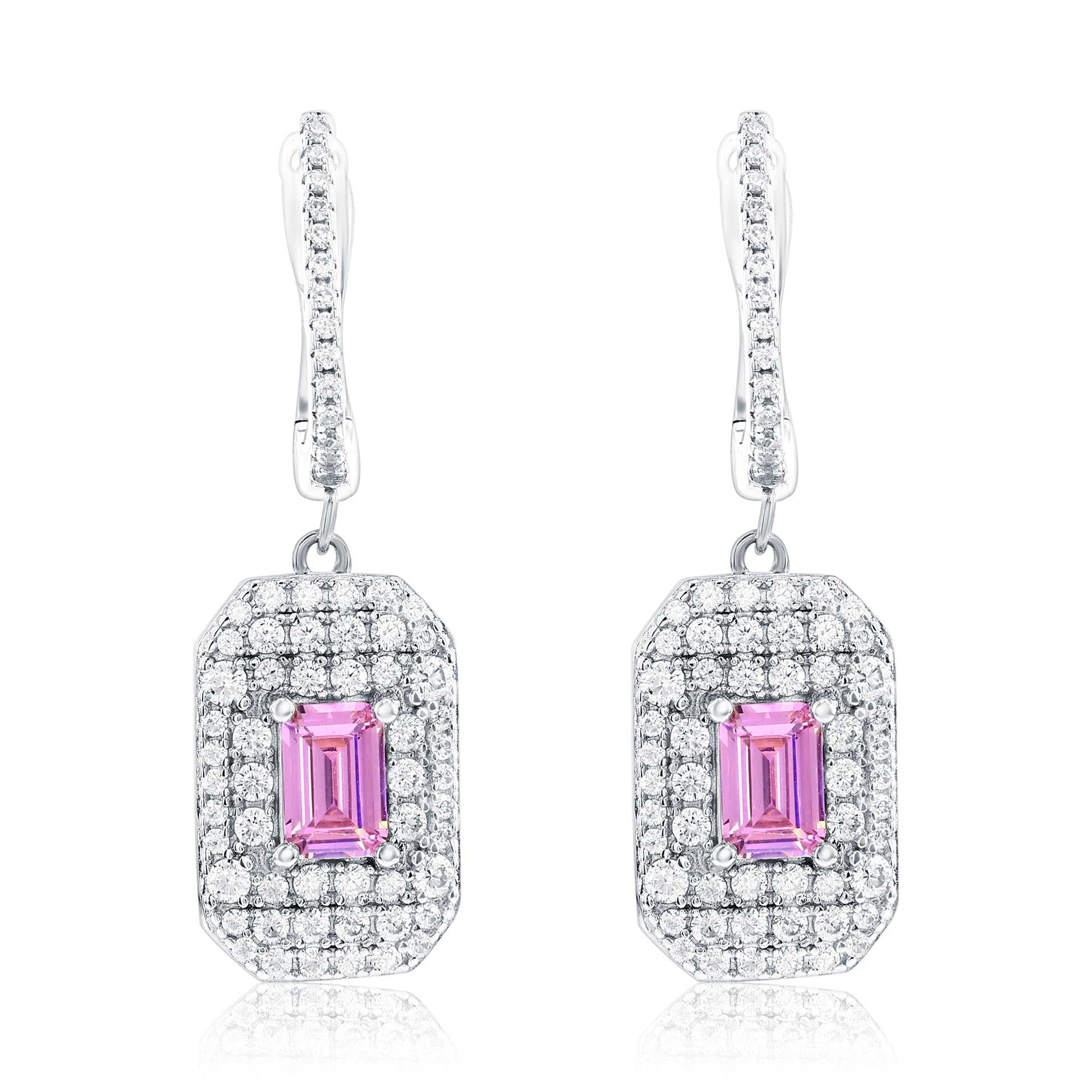 Suzy Levian Sterling Silver Emerald Cut Pink CZ & White CZ Pave Drop Earrings
