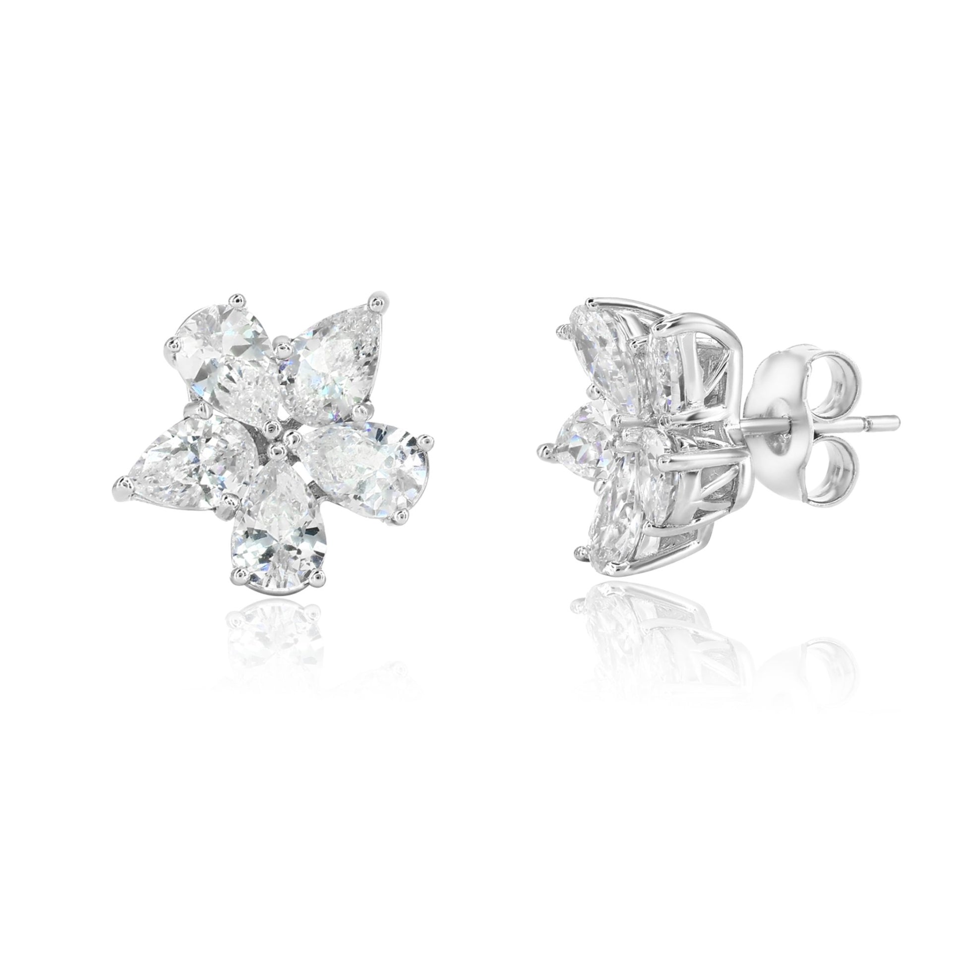 From our new spring line, these earrings are designed and crafted by Suzy Levian. Inspired by the beautiful spring time flower blooms, these fancy cluster studs will embellish and enrich every single outfit they will be matched to! These beautiful flower cluster earrings features five pear shape white cubic-zirconia's in each earring that are clustered together creating a beautiful flower design. These earrings are designed by Suzy Levian with a message. By creating jewelry that is beautiful inside and out, Suzy Levian's message is revealed through a hidden pink cubic-zirconia set in the back of both earrings to empower women to discover their inner strength, power and beauty. Back fancy gallery with a sterling silver two-tone setting, highlighting Suzy Levian's SL logo. These earrings secure with a butterfly closure for a snug-tight fit. 'Together we can inspire the world to appreciate the diamond in ourselves.' - S.L.