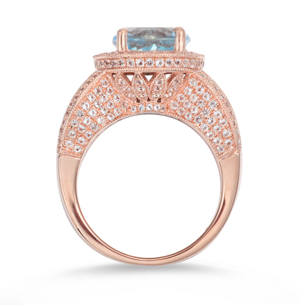 This Suzy Levian birthstone ring features a large, round-cut blue topaz gemstone (3.36ct), enwrapped with 242 sparkling white topaz gemstones for a halo design. This ring makes a great birthday gift or addition to a personal jewelry collection. The band is constructed from sterling silver, making it durable and easy to clean. The high-shine polish of the piece is sure to draw attention at any cocktail party or special event. Suitable for any occasion, this ring adds dimension to any outfit. Be the topic of conversation by pairing this ring with an evening gown for a special occasion or your favorite pair of jeans for a night on the town. This dazzling ring looks delicate and elegant on your hand and is sure to draw the attention of your friends and family. This ring is designed by Suzy Levian with a message. By creating jewelry that is beautiful inside and out, Suzy Levian's message is revealed through a hidden white topaz gemstone set inside the shank of this ring to empower women to discover their inner strength, power and beauty. This ring has a closed under-gallery with two-tone plating, highlighting Suzy Levian's Suzy Levian logo. Gemstone shapes: round Gemstone colors: blue, white One prong-set round-cut stone measures: 9 mm wide x 9 mm long Centerstone weight: 3.36 carats Total gemstone weight: 5.23 carats Metal: Sterling silver Number of white topaz: 242 Finish: High polish Ring setting dimensions: 23 mm wide x 13 mm long x 11 mm high Band dimensions: 3 mm