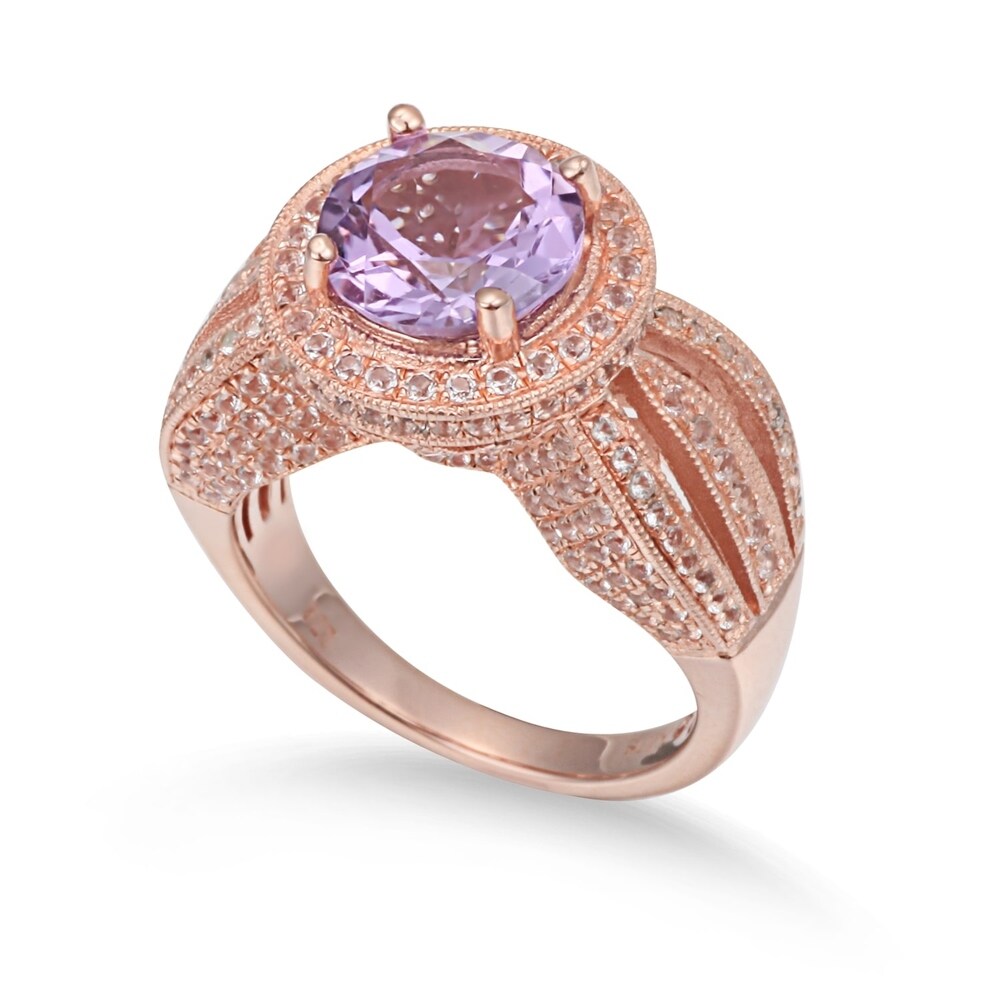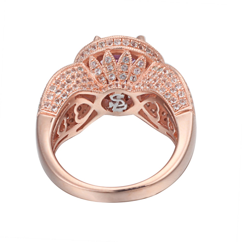This Suzy Levian birthstone ring features a large, round-cut purple amethyst gemstone (2.50ct), enwrapped with sparkling 242 white topaz gemstones for a halo design. This ring makes a great birthday gift or addition to a personal jewelry collection. The band is constructed from sterling silver, making it durable and easy to clean. The high-shine polish of the piece is sure to draw attention at any cocktail party or special event. Suitable for any occasion, this ring adds dimension to any outfit. Be the topic of conversation by pairing this ring with an evening gown for a special occasion or your favorite pair of jeans for a night on the town. This dazzling ring looks delicate and elegant on your hand and is sure to draw the attention of your friends and family. This ring is designed by Suzy Levian with a message. By creating jewelry that is beautiful inside and out, Suzy Levian's message is revealed through a hidden white topaz gemstone set inside the shank of this ring to empower women to discover their inner strength, power and beauty. This ring has a closed under-gallery with two-tone plating, highlighting Suzy Levian's Suzy Levian logo. Gemstone shapes: round Gemstone colors: white, purple One prong-set round-cut stone measures: 9 mm wide x 9 mm long Gemstone weight: 2.5 carats Total gemstone weight: 4.37 carats Metal: sterling silver Number of white topaz: 242 Finish: high polish Ring setting dimensions: 23 mm wide x 13 mm long x 11 mm high Band dimensions: 3 mm