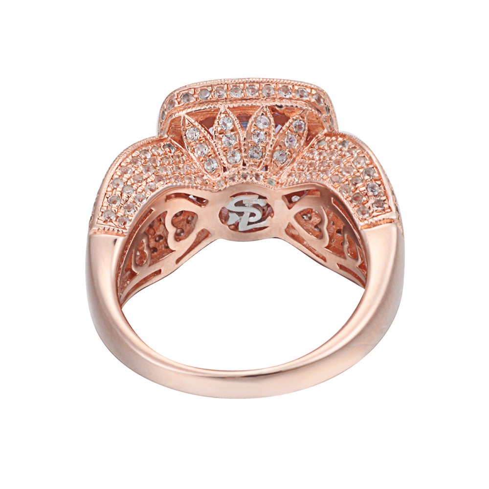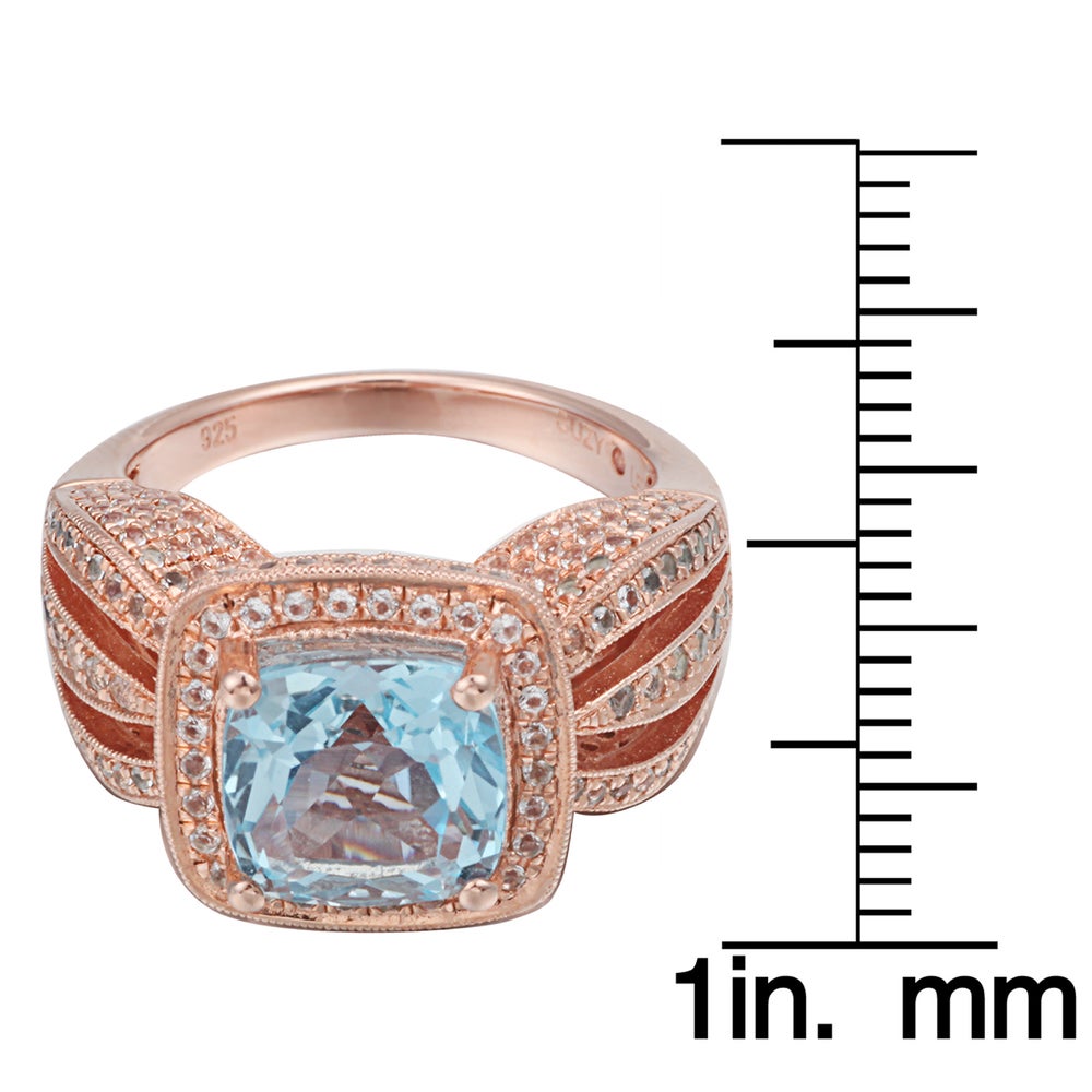 This Suzy Levian birthstone ring features a large, cushion-cut blue topaz gemstone centerpiece, enwrapped with sparkling 246 white topaz gemstones for a halo design. This ring makes a great birthday gift or addition to a personal jewelry collection. The band is constructed from sterling silver, making it durable and easy to clean. The high-shine polish of the piece is sure to draw attention at any cocktail party or special event. Suitable for any occasion, this ring adds dimension to any outfit. Be the topic of conversation by pairing this ring with an evening gown for a special occasion or your favorite pair of jeans for a night on the town. This dazzling ring looks delicate and elegant on your hand and is sure to draw the attention of your friends and family. This ring is designed by Suzy Levian with a message. By creating jewelry that is beautiful inside and out, Suzy Levian's message is revealed through a hidden white topaz gemstone set inside the shank of this ring to empower women to discover their inner strength, power and beauty. This ring has a closed under-gallery with two-tone plating, highlighting Suzy Levian's Suzy Levian logo. Gemstone shapes: cushion, round Gemstone colors: white, blue One prong-set cushion-cut stone measures: 9 mm wide x 9 mm long Gemstone weight: 4.14 carats Total gemstone weight: 6.04 carats Metal: Sterling silver Number of white topaz: 246 Finish: High polish Ring setting dimensions: 13.5 mm long x 23 mm wide x 11 mm high Band dimensions: 2 mm