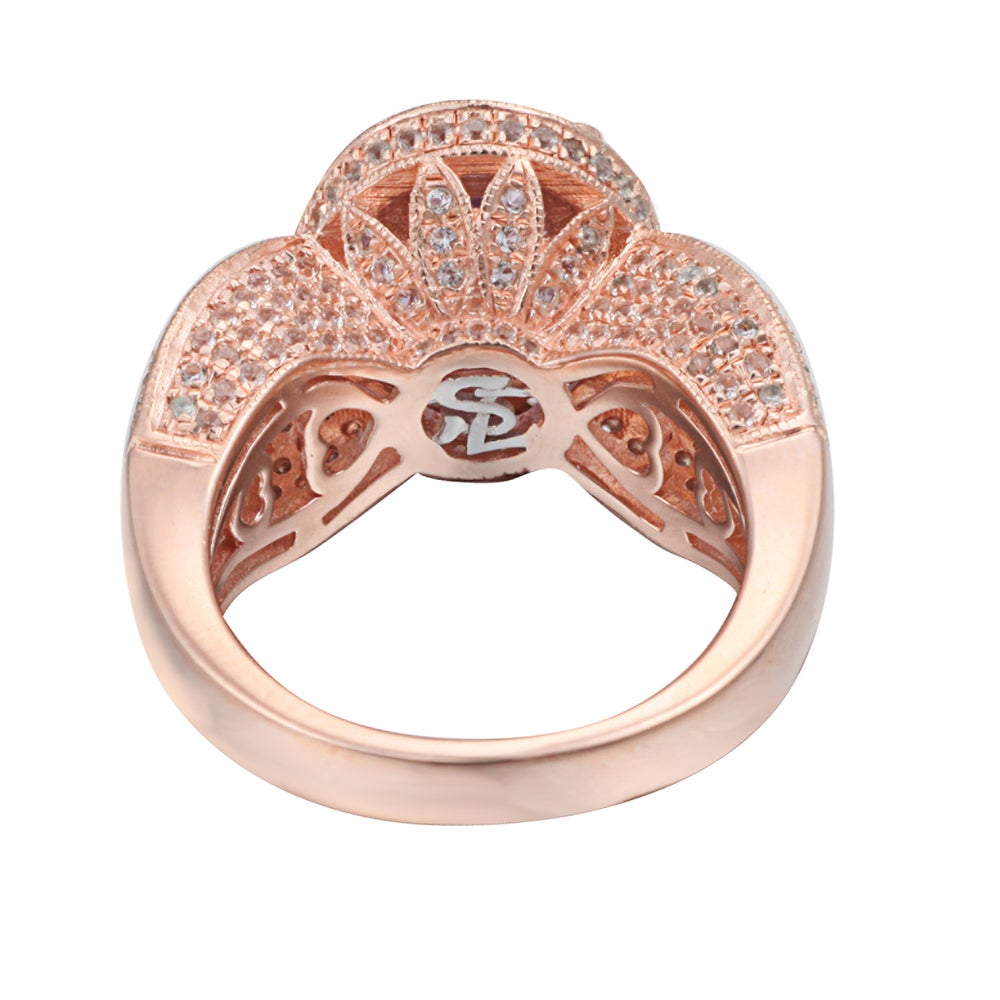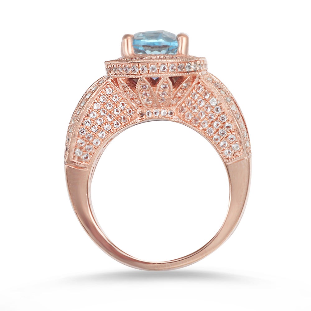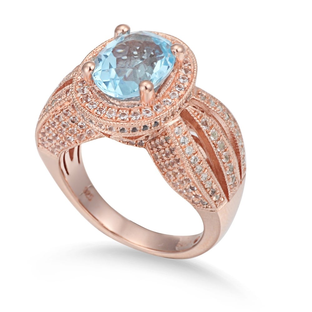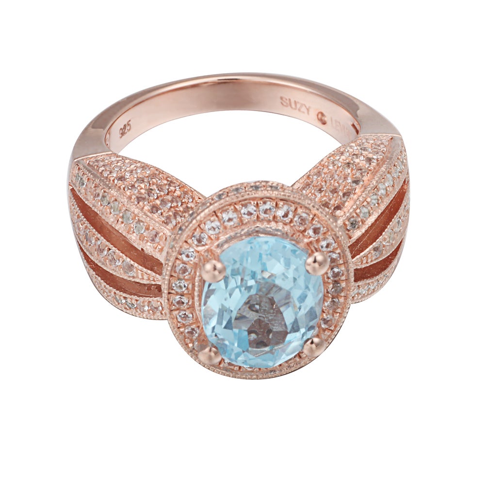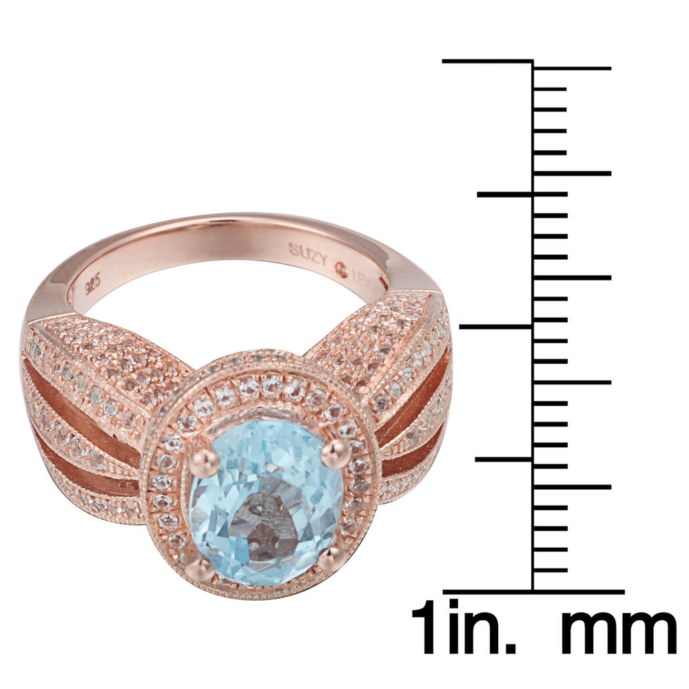 This Suzy Levian birthstone ring features a large, oval-cut blue topaz gemstone centerpiece, enwrapped with sparkling 246 white topaz gemstones for a halo design. This ring makes a great birthday gift or addition to a personal jewelry collection. The band is constructed from sterling silver, making it durable and easy to clean. The high-shine polish of the piece is sure to draw attention at any cocktail party or special event. Suitable for any occasion, this ring adds dimension to any outfit. Be the topic of conversation by pairing this ring with an evening gown for a special occasion or your favorite pair of jeans for a night on the town. This dazzling ring looks delicate and elegant on your hand and is sure to draw the attention of your friends and family. This ring is designed by Suzy Levian with a message. By creating jewelry that is beautiful inside and out, Suzy Levian's message is revealed through a hidden white topaz gemstone set inside the shank of this ring to empower women to discover their inner strength, power and beauty. This ring has a closed under-gallery with two-tone plating, highlighting Suzy Levian's Suzy Levian logo. Gemstone shapes: oval, round Gemstone colors: white, blue One prong-set oval-cut stone measures: 8 mm wide x 10 mm long Gemstone weight: 3.21 carats Total gemstone weight: 5.18 carats Metal: Sterling silver Number of white topaz: 246 Finish: High polish Ring setting dimensions: 15 mm long x 24 mm wide x 11 mm high Band dimensions: 3 mm