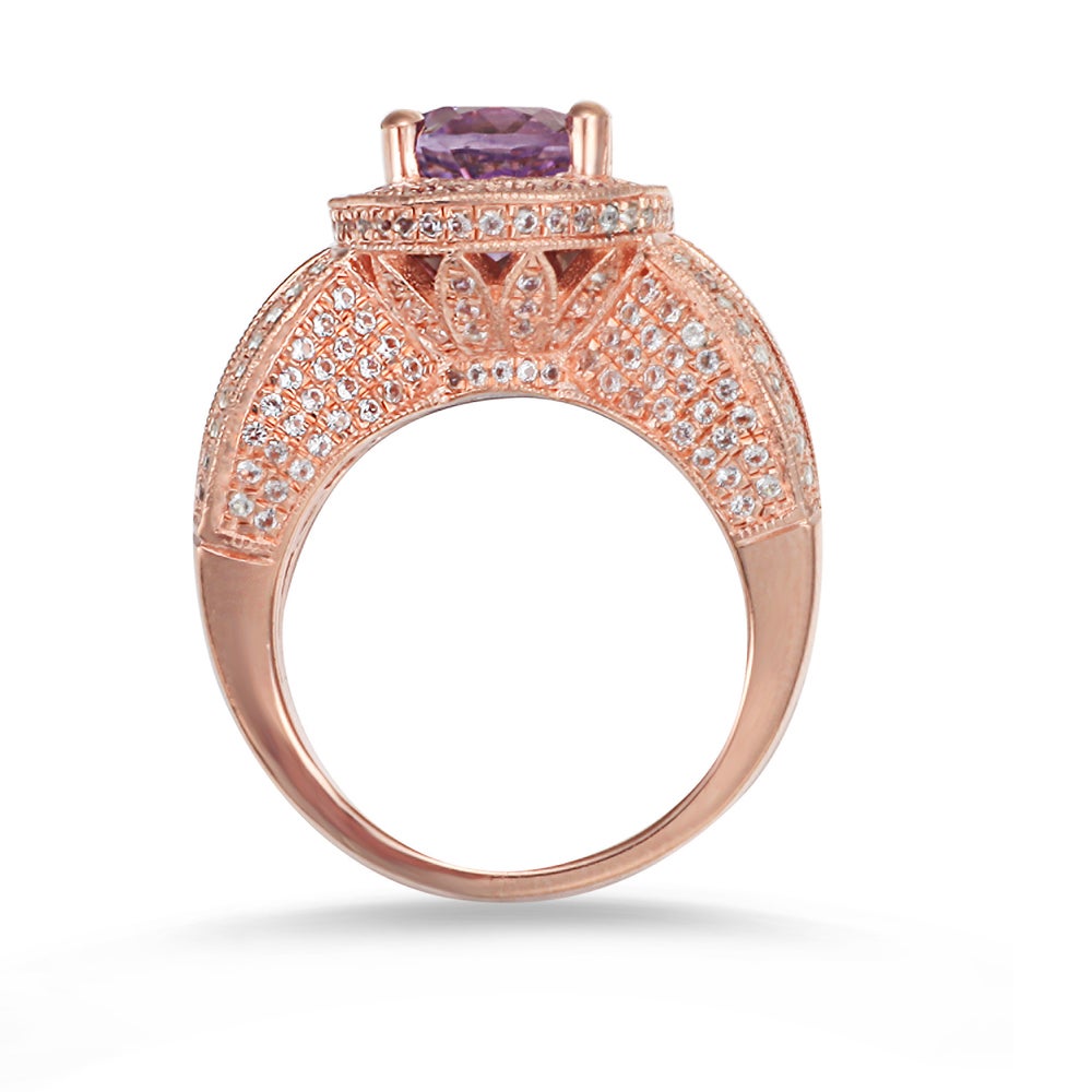This Suzy Levian birthstone ring features a large, oval-cut purple amethyst gemstone centerpiece, enwrapped with sparkling 246 white topaz gemstones for a halo design. This ring makes a great birthday gift or addition to a personal jewelry collection. The band is constructed from sterling silver, making it durable and easy to clean. The high-shine polish of the piece is sure to draw attention at any cocktail party or special event. Suitable for any occasion, this ring adds dimension to any outfit. Be the topic of conversation by pairing this ring with an evening gown for a special occasion or your favorite pair of jeans for a night on the town. This dazzling ring looks delicate and elegant on your hand and is sure to draw the attention of your friends and family. This ring is designed by Suzy Levian with a message. By creating jewelry that is beautiful inside and out, Suzy Levian's message is revealed through a hidden white topaz gemstone set inside the shank of this ring to empower women to discover their inner strength, power and beauty. This ring has a closed under-gallery with two-tone plating, highlighting Suzy Levian's Suzy Levian logo. Gemstone shapes: oval, round Gemstone colors: white, purple One prong-set oval-cut stone measures: 8 mm wide x 10 mm long Gemstone weight: 2.55 carats Total gemstone weight: 4.52 carats Metal: Sterling silver Number of white topaz: 246 Finish: High polish Ring setting dimensions: 15 mm long x 24 mm wide x 11 mm high Band dimensions: 3 mm