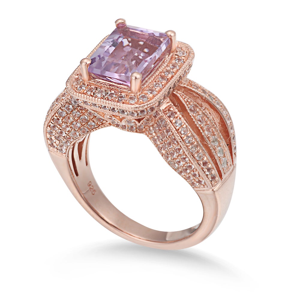 This Suzy Levian birthstone ring features a large, emerald-cut purple amethyst gemstone centerpiece, enwrapped with sparkling 252 white topaz gemstones for a halo design. This ring makes a great birthday gift or addition to a personal jewelry collection. The band is constructed from sterling silver, making it durable and easy to clean. The high-shine polish of the piece is sure to draw attention at any cocktail party or special event. Suitable for any occasion, this ring adds dimension to any outfit. Be the topic of conversation by pairing this ring with an evening gown for a special occasion or your favorite pair of jeans for a night on the town. This dazzling ring looks delicate and elegant on your hand and is sure to draw the attention of your friends and family. This ring is designed by Suzy Levian with a message. By creating jewelry that is beautiful inside and out, Suzy Levian's message is revealed through a hidden white topaz gemstone set inside the shank of this ring to empower women to discover their inner strength, power and beauty. This ring has a closed under-gallery with two-tone plating, highlighting Suzy Levian's Suzy Levian logo. Gemstone shapes: emerald, round Gemstone colors: white, purple One prong-set emerald-cut stone measures: 7 mm wide x 9 mm long Gemstone weight: 2.4 carats Total gemstone weight: 4.3 carats Metal: sterling silver Number of white topaz: 252 Finish: high polish Ring setting dimensions: 13 mm long x 23 mm wide x 10.5 mm high Band dimensions: 3 mm
