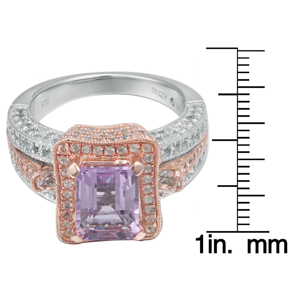 This beautiful emerald-cut birthstone ring from Suzy Levian features a 2.4 carat purple amethyst center stone, accentuated by 280 pave set white topaz gemstones. This ring is crafted of sterling silver with a high polish. This magnificent two-tone rose and sterling silver finish highlights the marvelous purple amethyst center stone. This ring is designed by Suzy Levian with a message. By creating jewelry that is beautiful inside and out, Suzy Levian's message is revealed through a hidden white topaz gemstone set inside the shank of this ring to empower women to discover their inner strength, power and beauty. This ring has a closed under-gallery with a two tone rose gold plating, highlighting Suzy Levian's Suzy Levian logo. This dazzling ring looks delicate and elegant on your hand and is sure to draw the attention of all your family and friends. The ring features a total of 2.35 carat of white topaz gemstones, with 280 white topaz gemstones framing the beautiful purple amethyst gemstone. Gemstone colors: Purple Amethyst, White Gemstone shapes: Emerald, Topaz One prong-set emerald-cut stone measures 7 mm wide x 9 mm long Gemstone weight: 2.4 carat Total gemstone weight: 5.2 carats Metal: Sterling silver Finish: High polish Ring setting dimensions: 23 mm wide x 14 mm long x 9 mm high Band dimensions: 2 mm