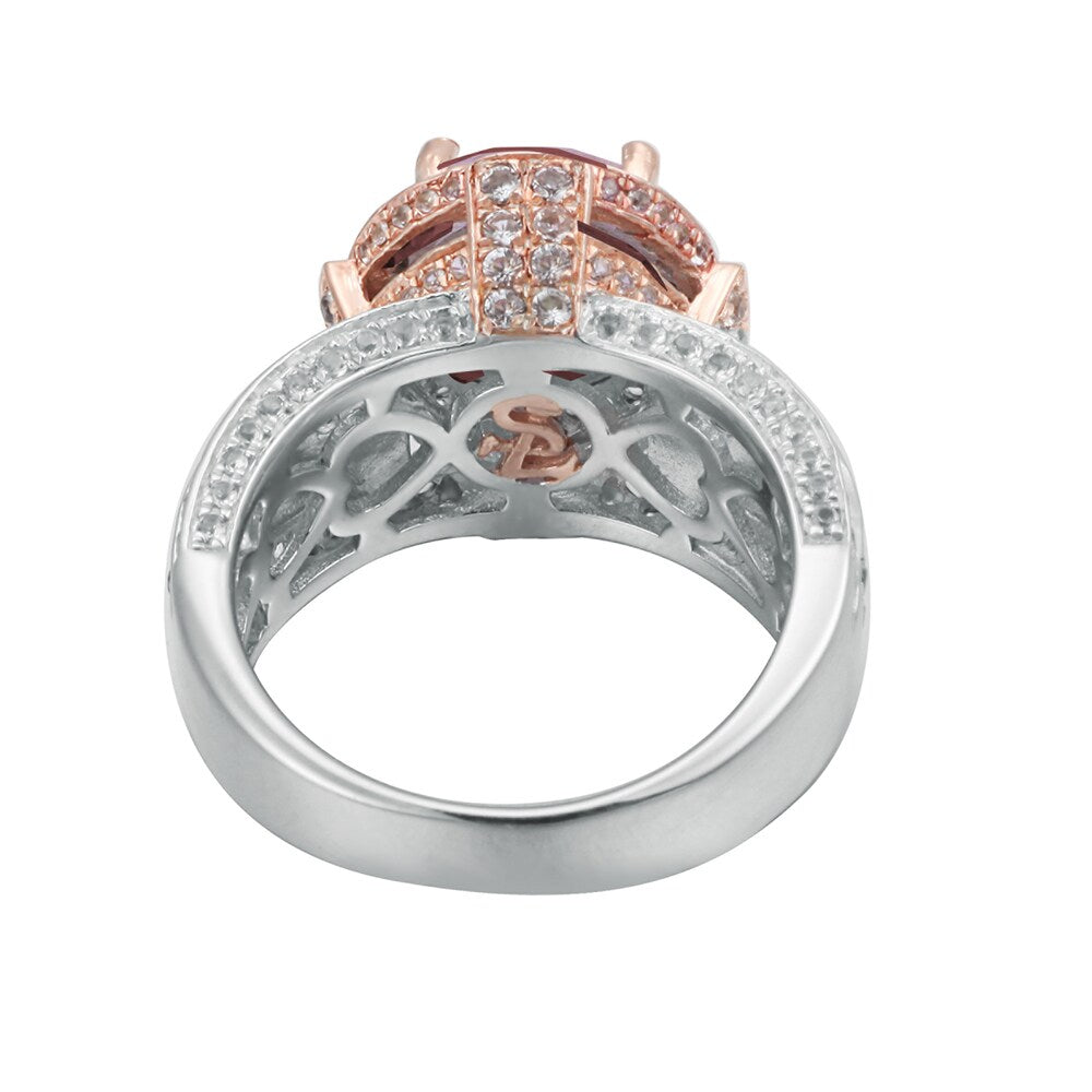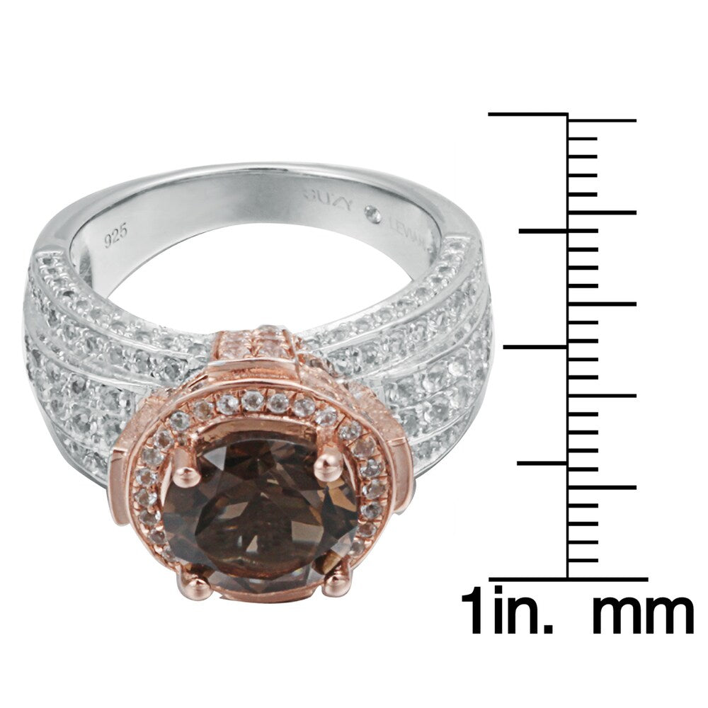 This beautiful round-cut birthstone ring from Suzy Levian features a 2.5 carat smoky quartz center stone, accentuated by 196 pave set white topaz gemstones. This ring is crafted of sterling silver with a high polish. This magnificent two-tone rose and sterling silver finish highlights the marvelous smoky quartz center stone.This ring is designed by Suzy Levian with a message. By creating jewelry that is beautiful inside and out, Suzy Levian's message is revealed through a hidden white topaz gemstone set inside the shank of this ring to empower women to discover their inner strength, power and beauty. This ring has a closed under-gallery with a two tone rose gold plating, highlighting Suzy Levian's Suzy Levian logo. This dazzling ring looks delicate and elegant on your hand and is sure to draw the attention of all your family and friends. The ring features a total of 2.35 carat of white topaz gemstones, with 196 white topaz gemstones framing the beautiful smoky quartz gemstone. Gemstone shapes: Round One prong-set round-cut stone measures 9 mm wide x 9 mm long Gemstone weight: 2.5 carat Total gemstone weight: 4.85 carats Metal: Sterling silver Finish: High polish Ring setting dimensions: 22 mm wide x 13 mm long x 11 mm high Band dimensions: 4 mm