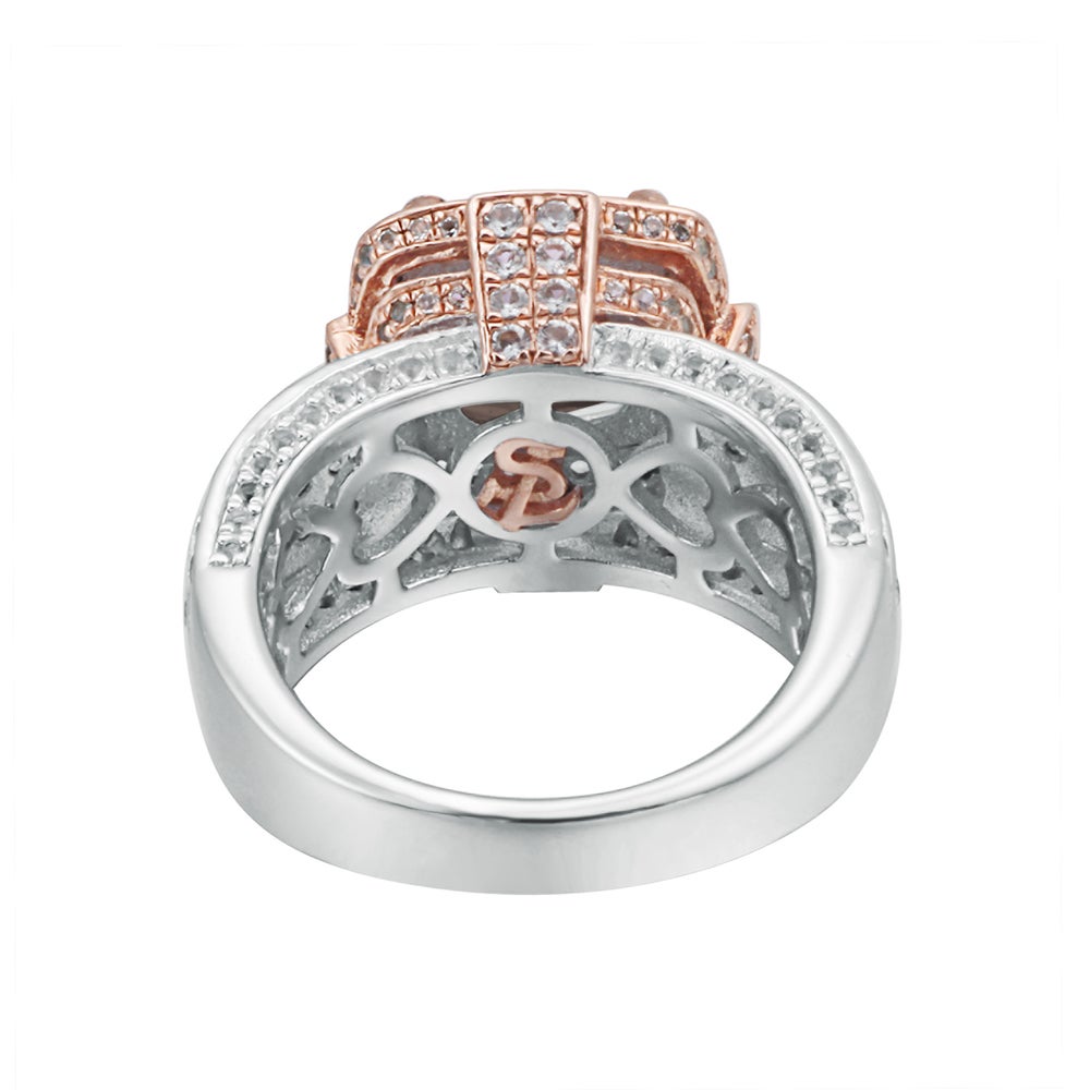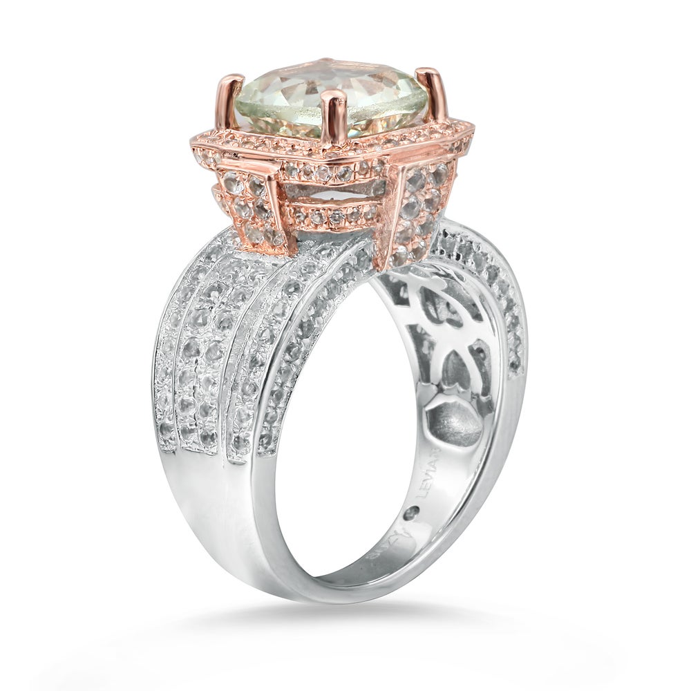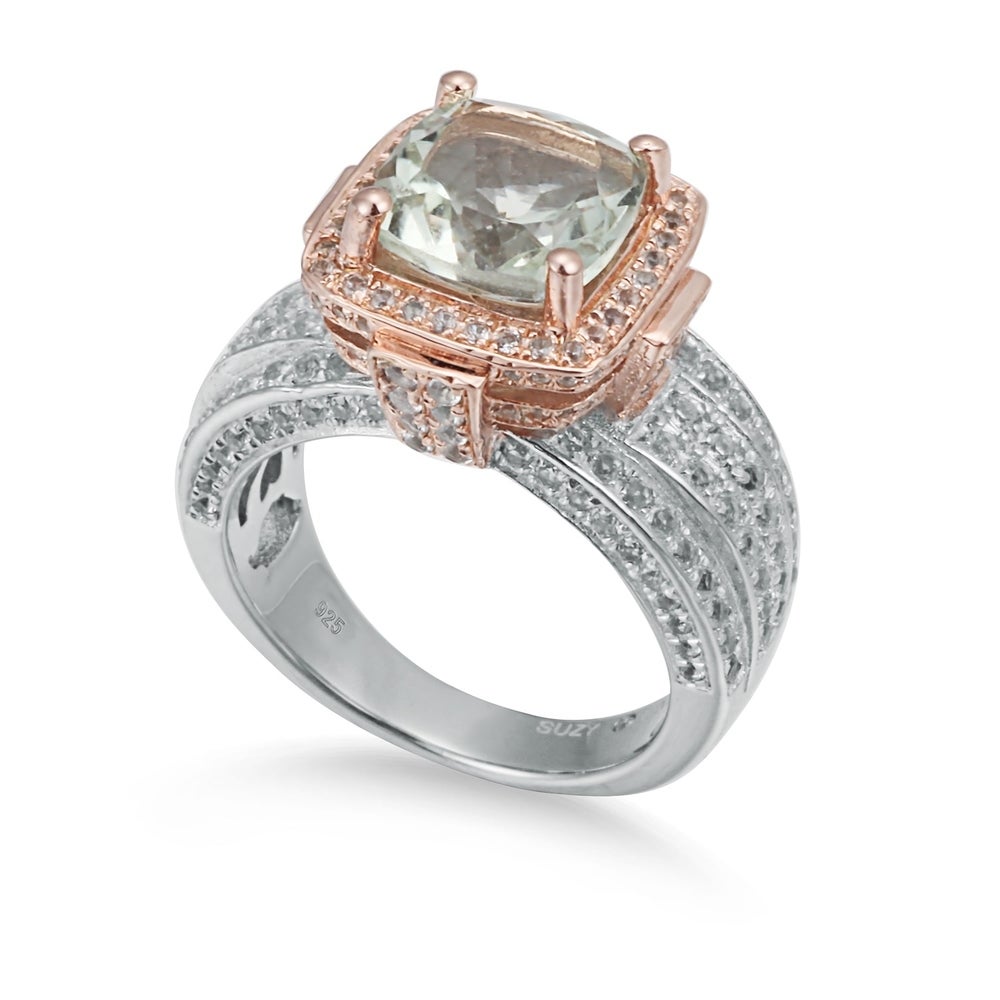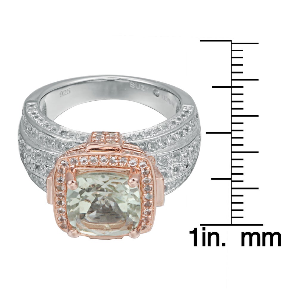 This beautiful cushion-cut birthstone ring from Suzy Levian features a 3 carat green amethyst center stone, accentuated by 208 pave set white topaz gemstones. This ring is crafted of sterling silver with a high polish. This magnificent two-tone rose and sterling silver finish highlights the marvelous green amethyst center stone. This ring is designed by Suzy Levian with a message. By creating jewelry that is beautiful inside and out, Suzy Levian's message is revealed through a hidden white topaz gemstone set inside the shank of this ring to empower women to discover their inner strength, power and beauty. This ring has a closed under-gallery with a two tone rose gold plating, highlighting Suzy Levian's Suzy Levian logo. This dazzling ring looks delicate and elegant on your hand and is sure to draw the attention of all your family and friends. The ring features a total of 2.36 carat of white topaz gemstones, with 208 white topaz gemstones framing the beautiful green amethyst gemstone. Gemstone shapes: Cushion One prong-set cushion-cut stone measures 9 mm wide x 9 mm long Gemstone weight: 3 carat Total gemstone weight: 5.36 carats Metal: Sterling silver Finish: High polish Ring setting dimensions: 23 mm wide x 14 mm long x 10 mm high Band dimensions: 4 mm