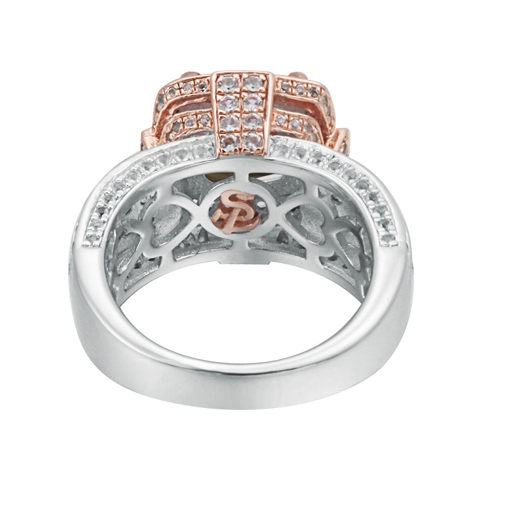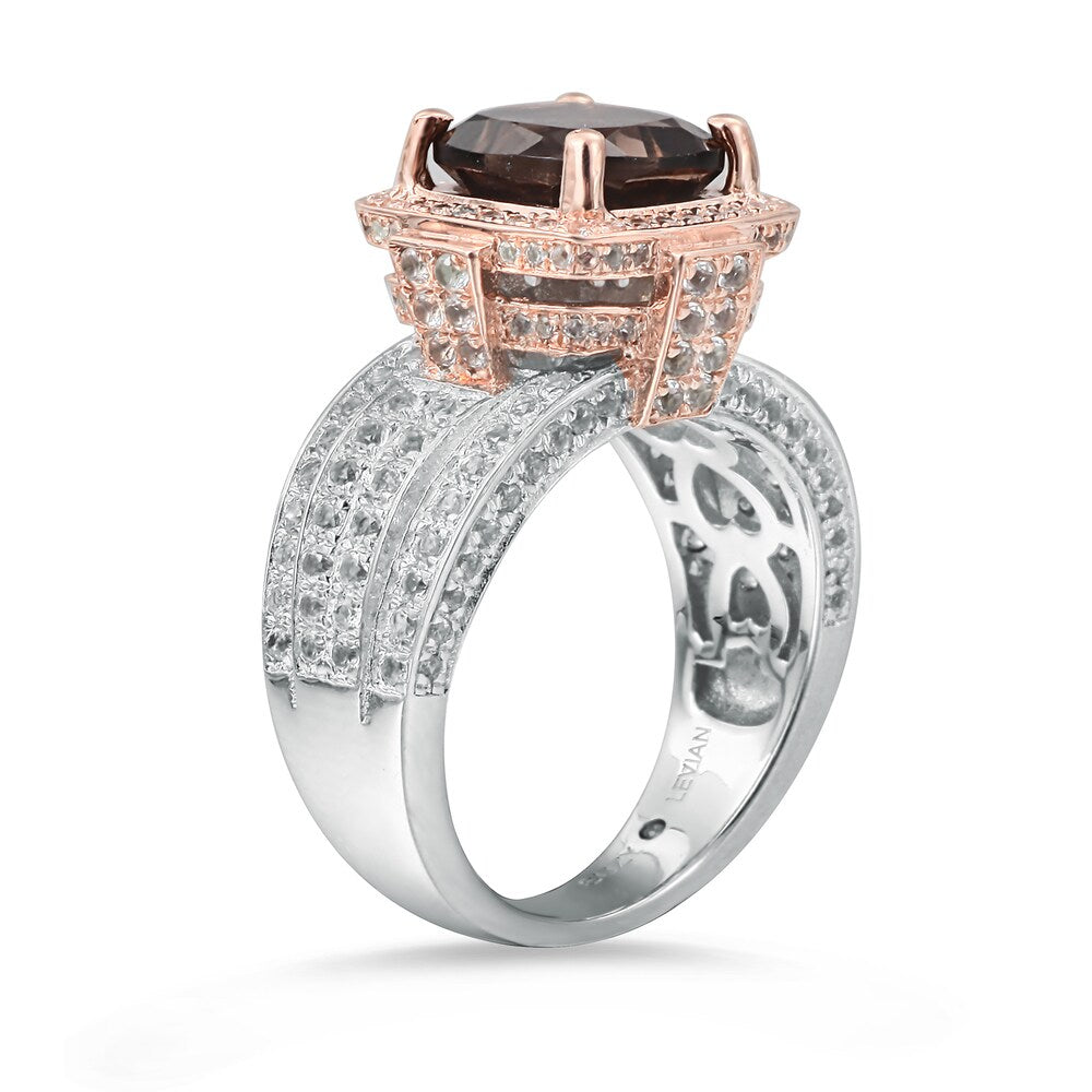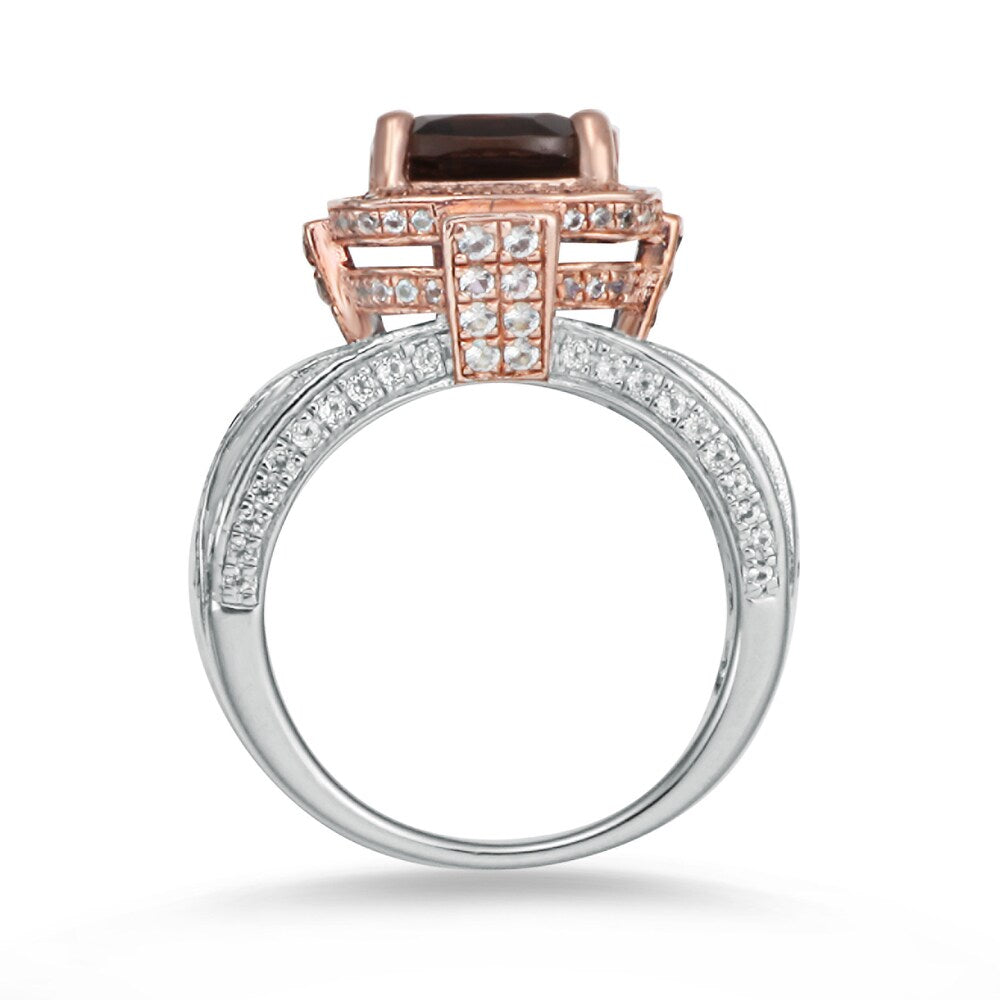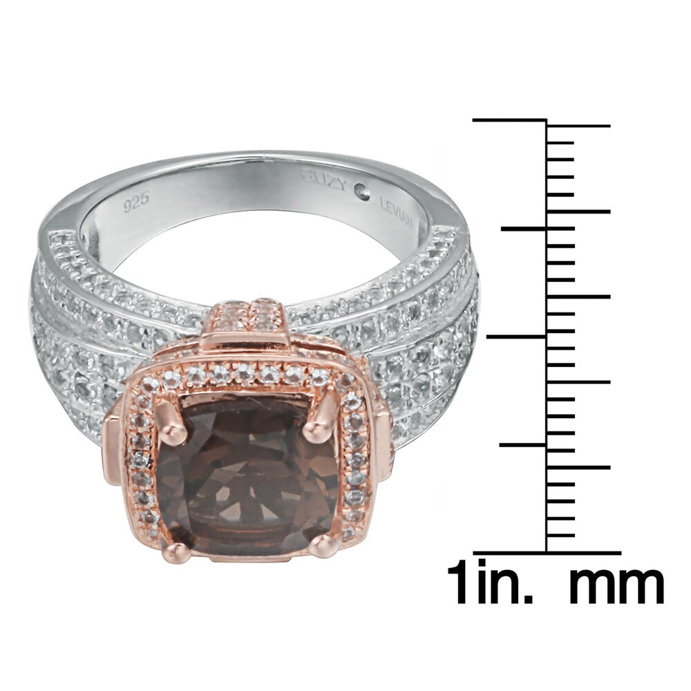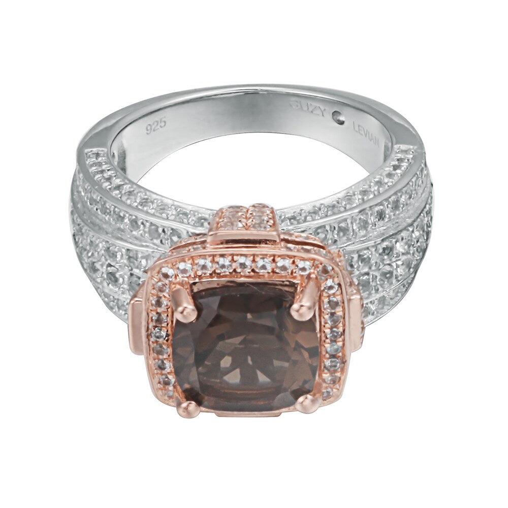 This beautiful cushion-cut birthstone ring from Suzy Levian features a 2.6 carat smoky quartz center stone, accentuated by 208 pave set white topaz gemstones. This ring is crafted of sterling silver with a high polish. This magnificent two-tone rose and sterling silver finish highlights the marvelous smoky quartz center stone.This ring is designed by Suzy Levian with a message. By creating jewelry that is beautiful inside and out, Suzy Levian's message is revealed through a hidden white topaz gemstone set inside the shank of this ring to empower women to discover their inner strength, power and beauty. This ring has a closed under-gallery with a two tone rose gold plating, highlighting Suzy Levian's Suzy Levian logo. This dazzling ring looks delicate and elegant on your hand and is sure to draw the attention of all your family and friends. The ring features a total of 2.36 carat of white topaz gemstones, with 208 white topaz gemstones framing the beautiful smoky quartz gemstone. Gemstone shapes: Cushion One prong-set cushion-cut stone measures 9 mm wide x 9 mm long Gemstone weight: 2.6 carat Total gemstone weight: 4.96 carats Metal: Sterling silver Finish: High polish Ring setting dimensions: 23 mm wide x 14 mm long x 10 mm high Band dimensions: 4 mm