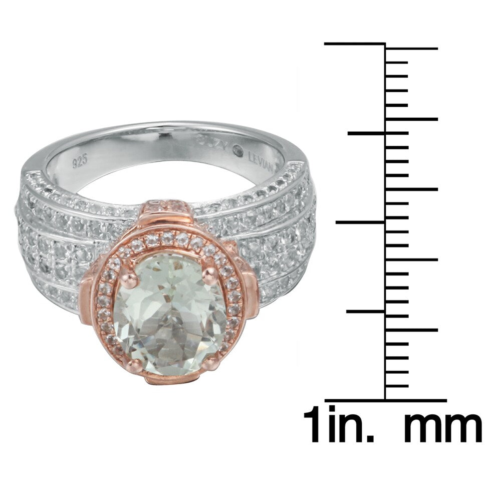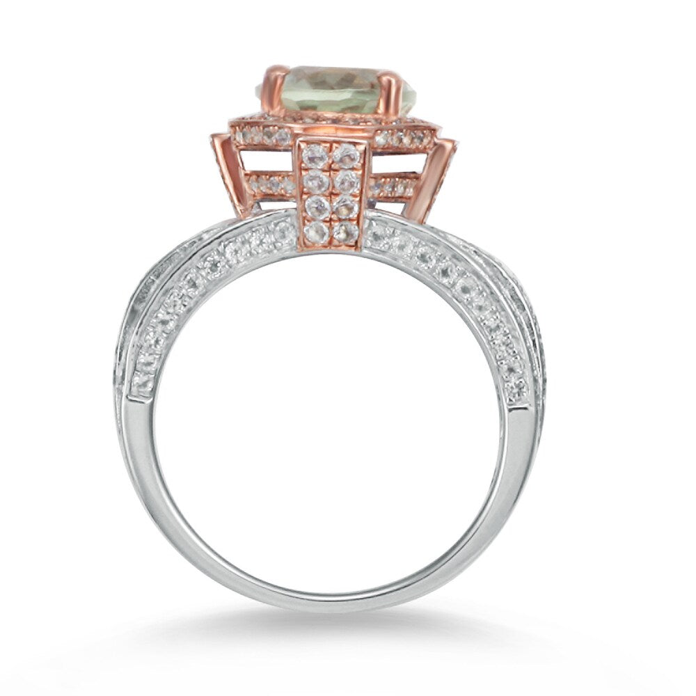 This beautiful oval-cut birthstone ring from Suzy Levian features a 2.38 carat green amethyst center stone, accentuated by 198 pave set white topaz gemstones. This ring is crafted of sterling silver with a high polish. This magnificent two-tone rose and sterling silver finish highlights the marvelous green amethyst center stone. This ring is designed by Suzy Levian with a message. By creating jewelry that is beautiful inside and out, Suzy Levian's message is revealed through a hidden white topaz gemstone set inside the shank of this ring to empower women to discover their inner strength, power and beauty. This ring has a closed under-gallery with a two tone rose gold plating, highlighting Suzy Levian's Suzy Levian logo. This dazzling ring looks delicate and elegant on your hand and is sure to draw the attention of all your family and friends. The ring features a total of 2.35 carat of white topaz gemstones, with 198 white topaz gemstones framing the beautiful green amethyst gemstone. Gemstone colors: Green, White Gemstone shapes: Oval, Round One prong-set oval-cut stone measures 8 mm wide x 10 mm long Gemstone weight: 2.38 carat Total gemstone weight: 4.73 carats Metal: Sterling Silver Finish: High polish Ring setting dimensions: 23 mm wide x 14 mm long x 10 mm high Band dimensions: 3 mm