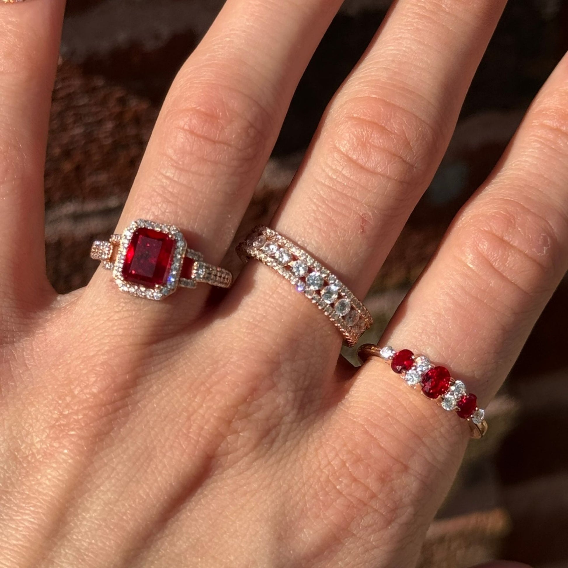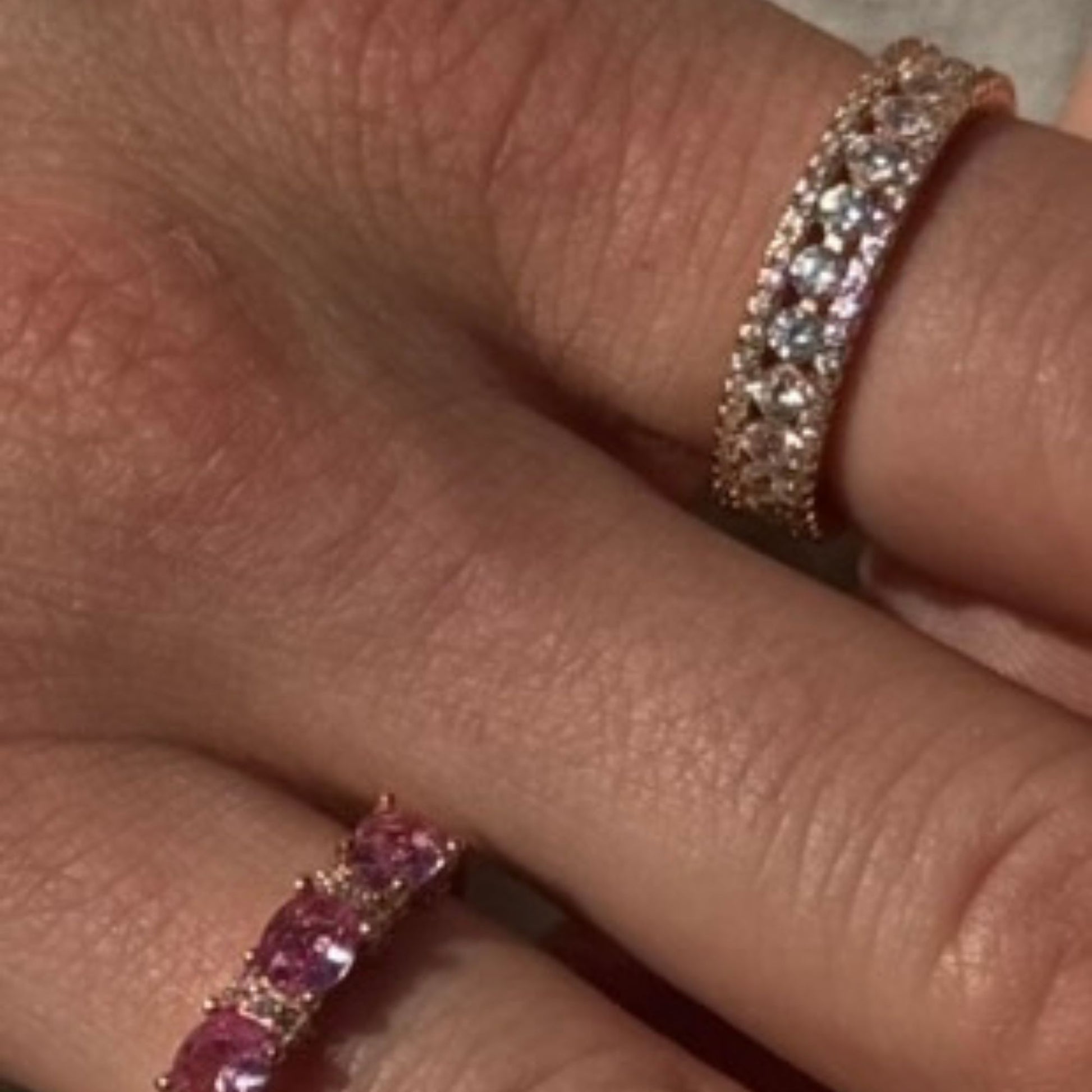 A symbol of love that will last an eternity. This ring is filled with neutral color and modern fashion, featuring larger round-cut white pave cubic zirconia bar-set between two rows of smaller round-cut white pave set cubic zirconia, hand set in rose plated 925 sterling silver.Surprise someone special in your life with this luxurious anniversary ring. Three rows of white round-cut gemstones set in high-polish rosed sterling silver setting create a ring that's not only strickingly gorgeous but reminds your special someone that your love lasts for all eternity! This special ring is an eye-catching way to add sparkle to your look.This ring is designed by Suzy Levian with a message. By creating jewelry that is beautiful inside and out, Suzy Levian's message is revealed through a hidden gemstone set in the shank of this ring to empower women to discover their inner strength, power and beauty. This ring has a closed under-gallery for comfort fit with a two-tone setting, highlighting Suzy Levian's Suzy Levian logo. 'Together we can inspire the world to appreciate the diamond in ourselves.' - Suzy Levian
