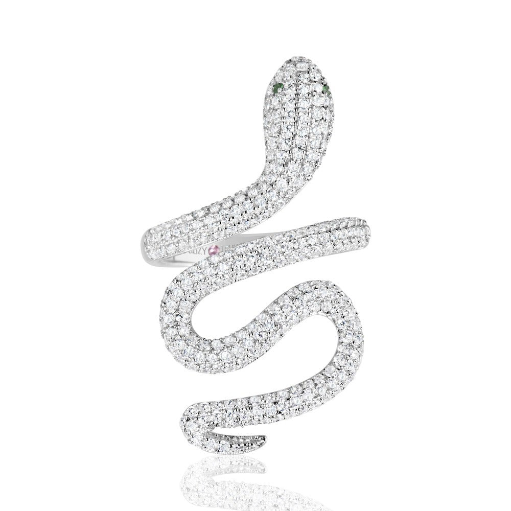 Charm the snake within you with this eye-catching ring, featuring sparkling white pave cubic zirconias with green pave cubic zirconia colored eyes, hand set in sterling silver. The elegant swirls and intricate twists, create a look that makes it the perfect ring to express the fierce woman inside of you!