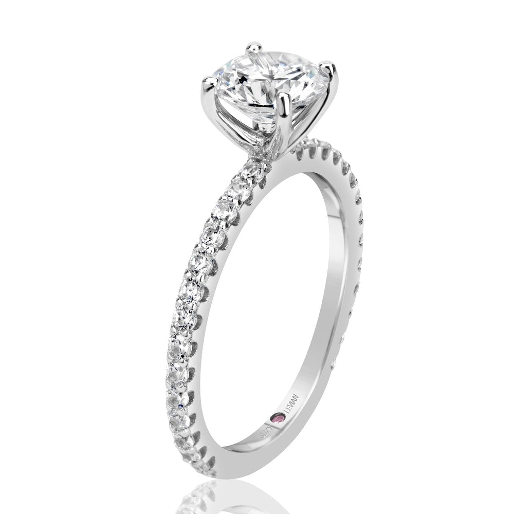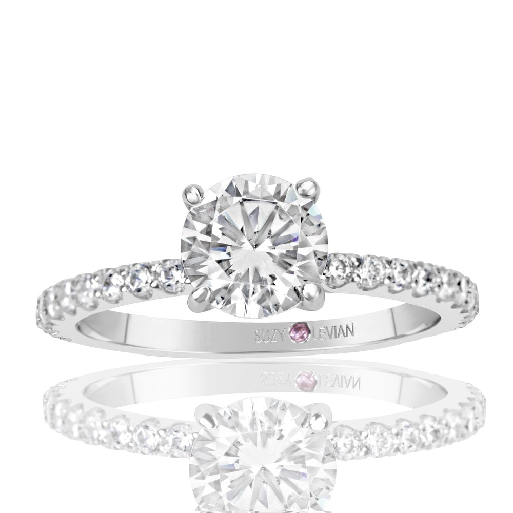 This classic bridal engagement ring features a round-cut white cubic zirconia center stone with shimmering round-cut cubic zirconia gemstones going down the band, hand-set in sterling silver. The round-cut center stone is secured with a "V" four prong setting. This ring is designed by Suzy Levian with a message. By creating jewelry that is beautiful inside and out, Suzy Levian's message is revealed through a hidden stone set in the shank of this ring to empower women to discover their inner strength, power and beauty. This ring has a closed under-gallery with a two tone rose gold plating, highlighting Suzy Levian's SL logo.