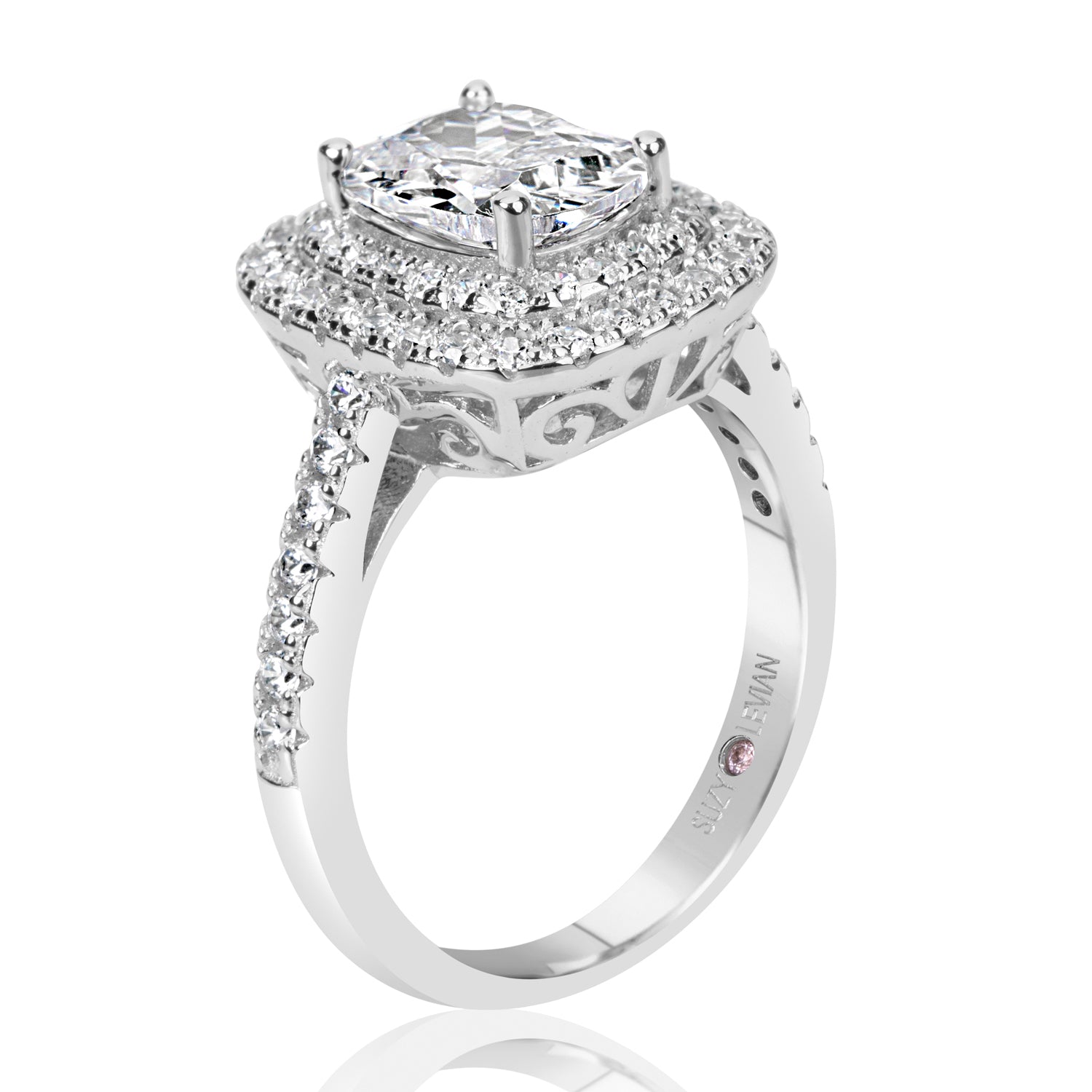 It's a taste you can see! Add a classy and elegant element to your style. This sophisticated ring features a cushion-cut white cubic zirconia center stone with a double pave halo of round cut white cubic zirconia around it. For a perfect finish this ring is hand set in sterling silver with a high polish finish. This ring is designed by Suzy Levian with a message. By creating jewelry that is beautiful inside and out, Suzy Levian's message is revealed through a hidden pink cubic zirconia set in the shank of this ring to empower women to discover their inner strength, power and beauty. This ring has a closed under-gallery for comfort fit with a two-tone setting, highlighting Suzy Levian SL logo in rose plating. 'Together we can inspire the world to appreciate the diamond in ourselves.' - Suzy Levian