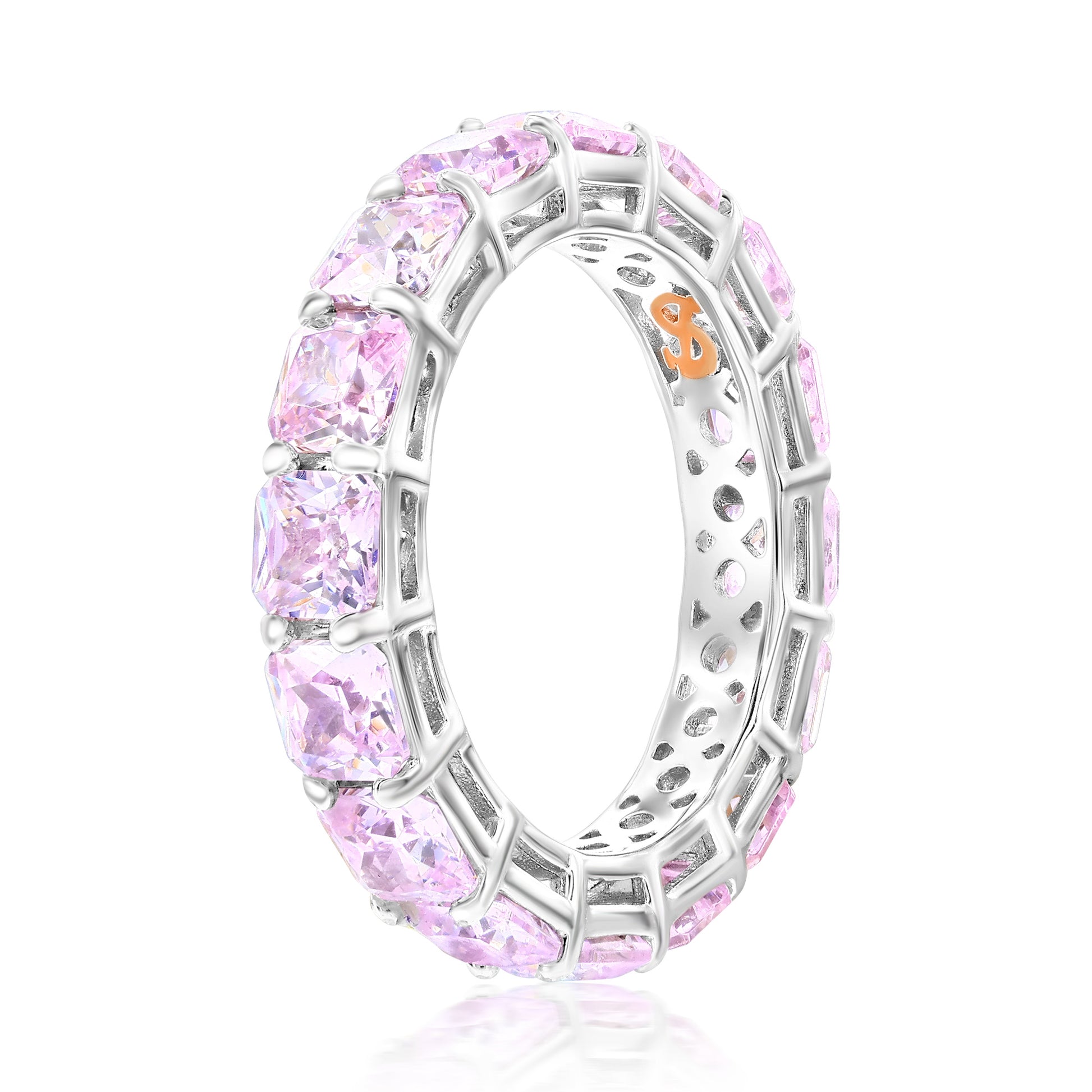 Stunning, timeless and classy eternity band ring. This brilliant ring is filled with rich, high quality cushion cut pink cubic zirconia gemstones, hand set in the trendiest, yet classy, basket setting in Suzy Levian's signature high polished 925 sterling silver. Every single ring is man made, making it a unique masterpiece. Surprise someone special in your life with this luxurious eternity band. This ring is designed by Suzy Levian with a message. By creating jewelry that is beautiful inside and out, Suzy Levian's message is revealed through a hidden stone set in the shank of this ring to empower women to discover their inner strength, power and beauty. This ring has a closed under-gallery for comfort fit. 'Together we can inspire the world to appreciate the diamond in ourselves.' - Suzy Levian