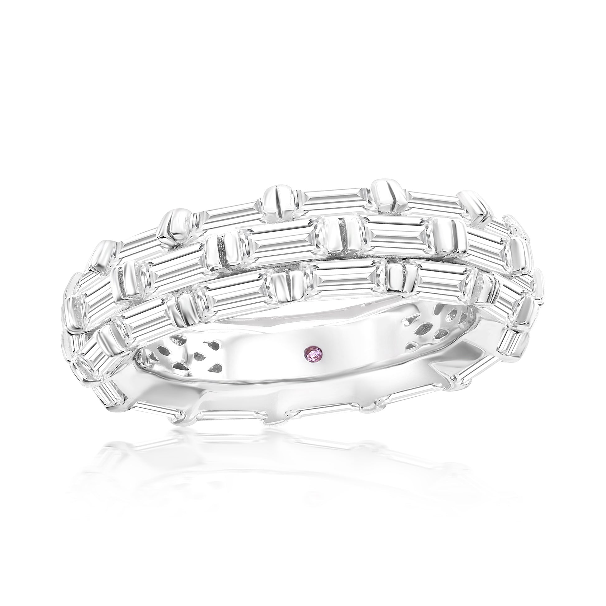 A symbol of love that will last an eternity. This ring is filled with neutral color and modern fashion, featuring prong set emerald cut baguette white cubic zirconia, set in 925 sterling silver. Three rows are attached to give a larger than life look with extra sparkle for all to admire. Surprise someone special in your life with this luxurious anniversary band. The mix of round and baguette-cut gemstones create a look that's not only strikingly gorgeous but reminds your special someone that your love lasts for all eternity! This ring is designed by Suzy Levian with a message. By creating jewelry that is beautiful inside and out, Suzy Levian's message is revealed through a hidden gemstone set in the shank of this ring to empower women to discover their inner strength, power and beauty. This ring has a closed inside-gallery for comfort fit with a two-tone setting, highlighting Suzy Levian's SL logo. 'Together we can inspire the world to appreciate the diamond in ourselves.' - Suzy Levian