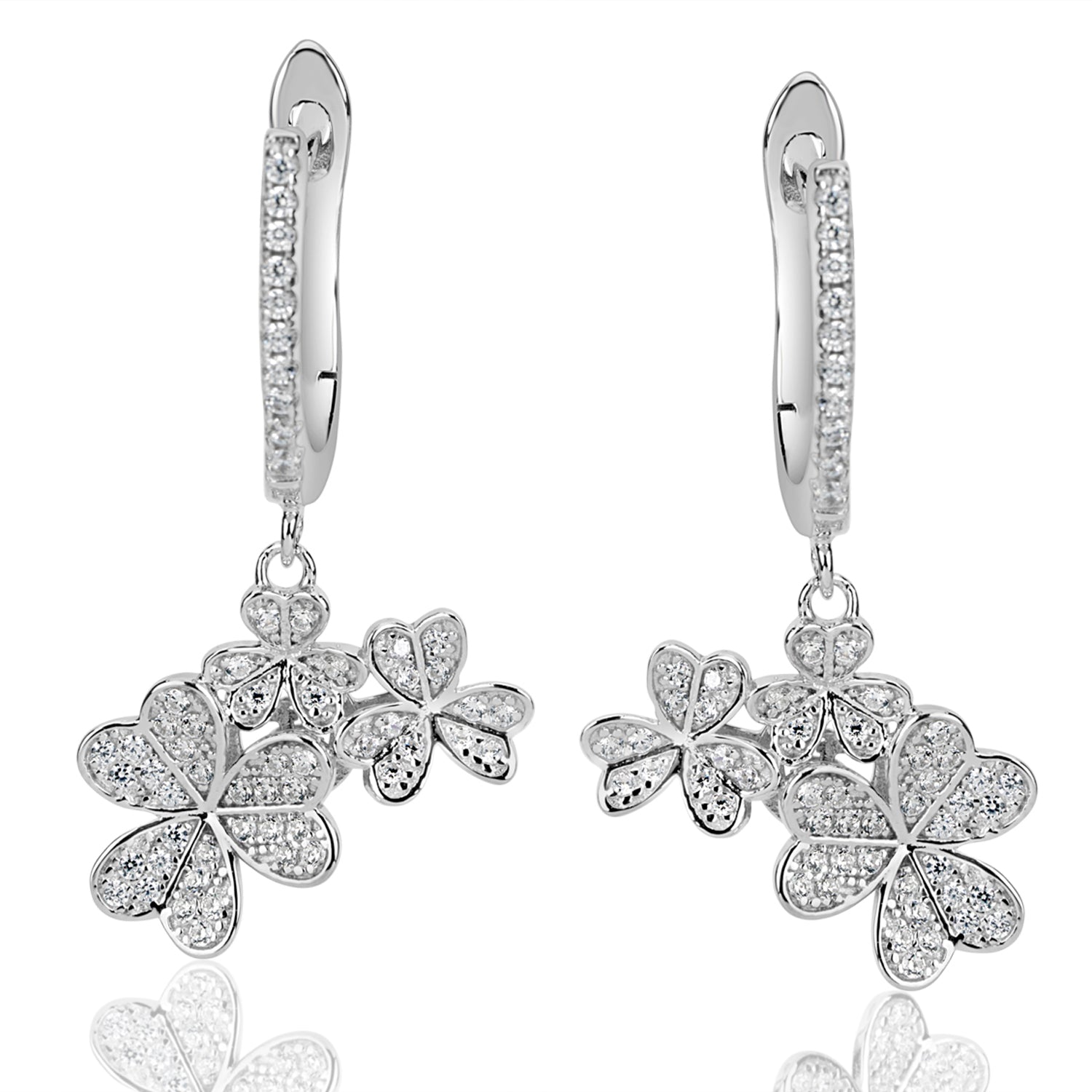 Let these beautiful bouquets of flowers shine through on you with this whimsical pair of flower earrings featuring white cubic zirconia pave, hand set in sterling silver. This earring is designed by Suzy Levian with a message. By creating jewelry that is beautiful inside and out, Suzy Levian's message is revealed through a hidden stone set inside the shank of these earrings to empower women to discover their inner strength, power and beauty. 'Together we can inspire the world to appreciate the diamond in ourselves.' - Suzy Levian