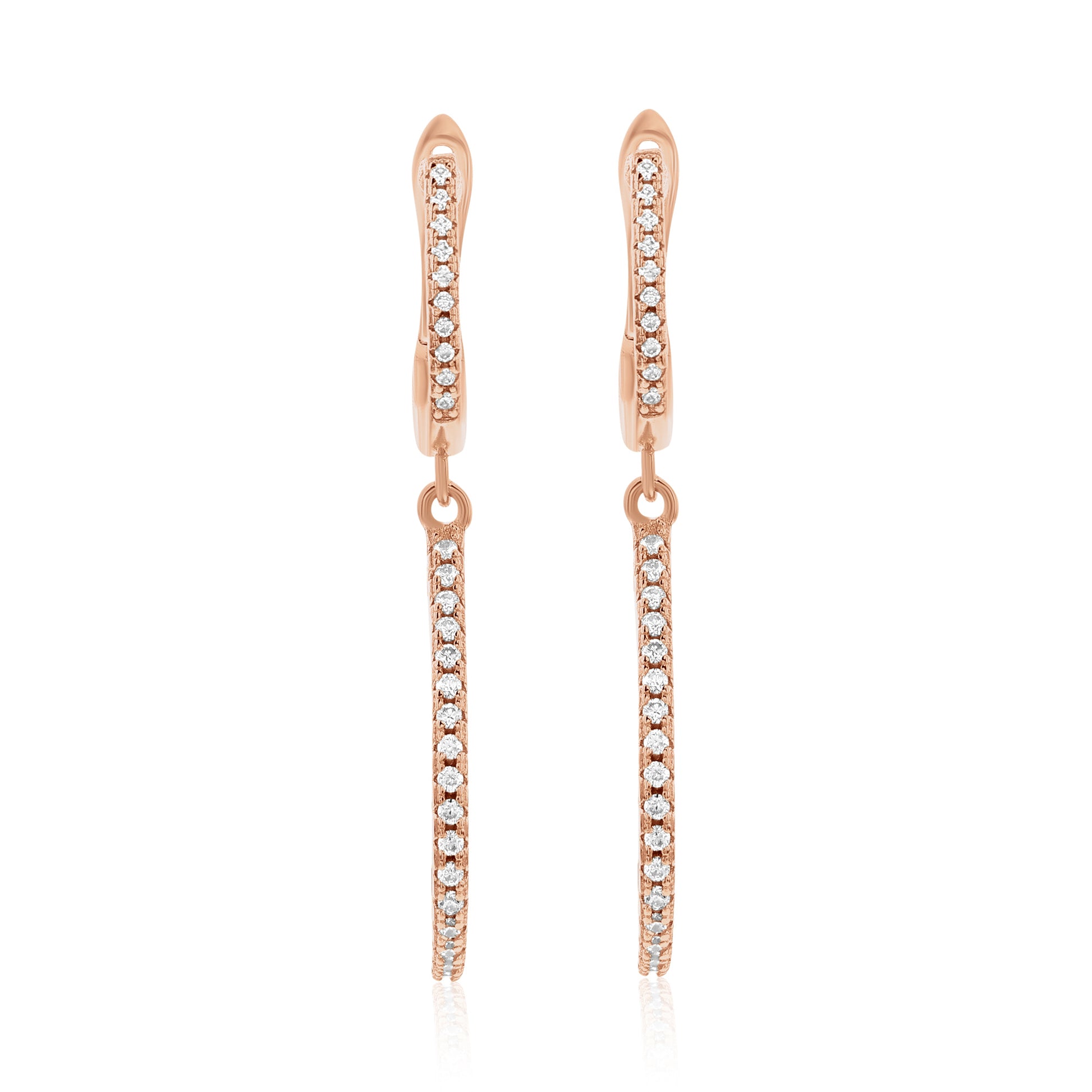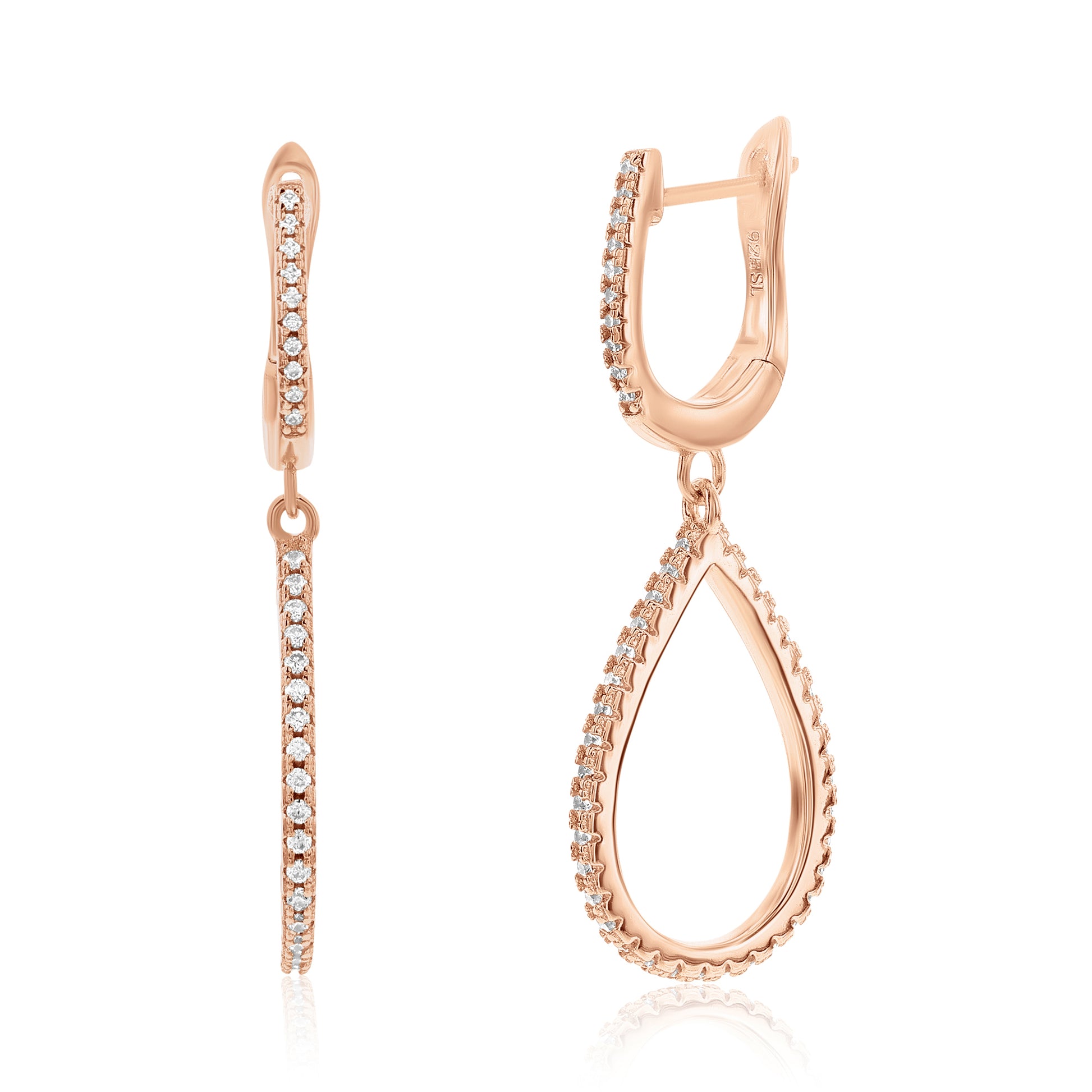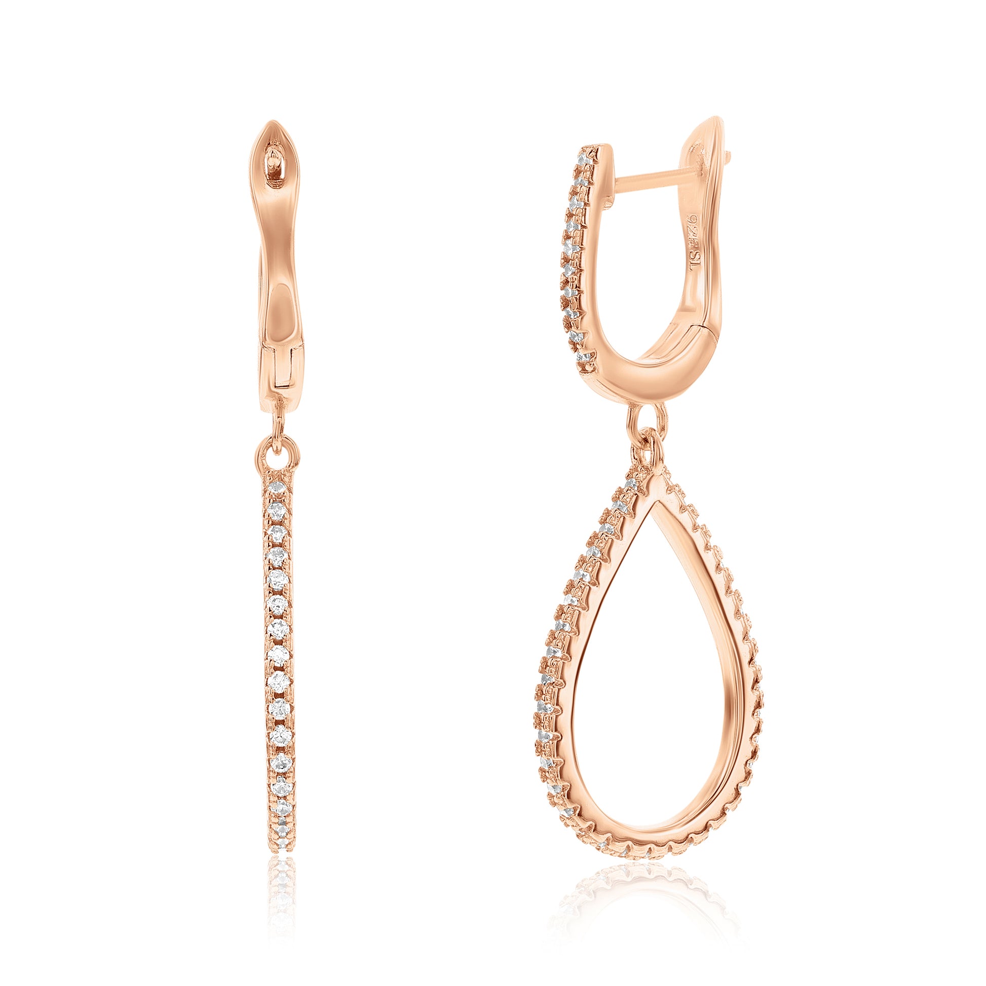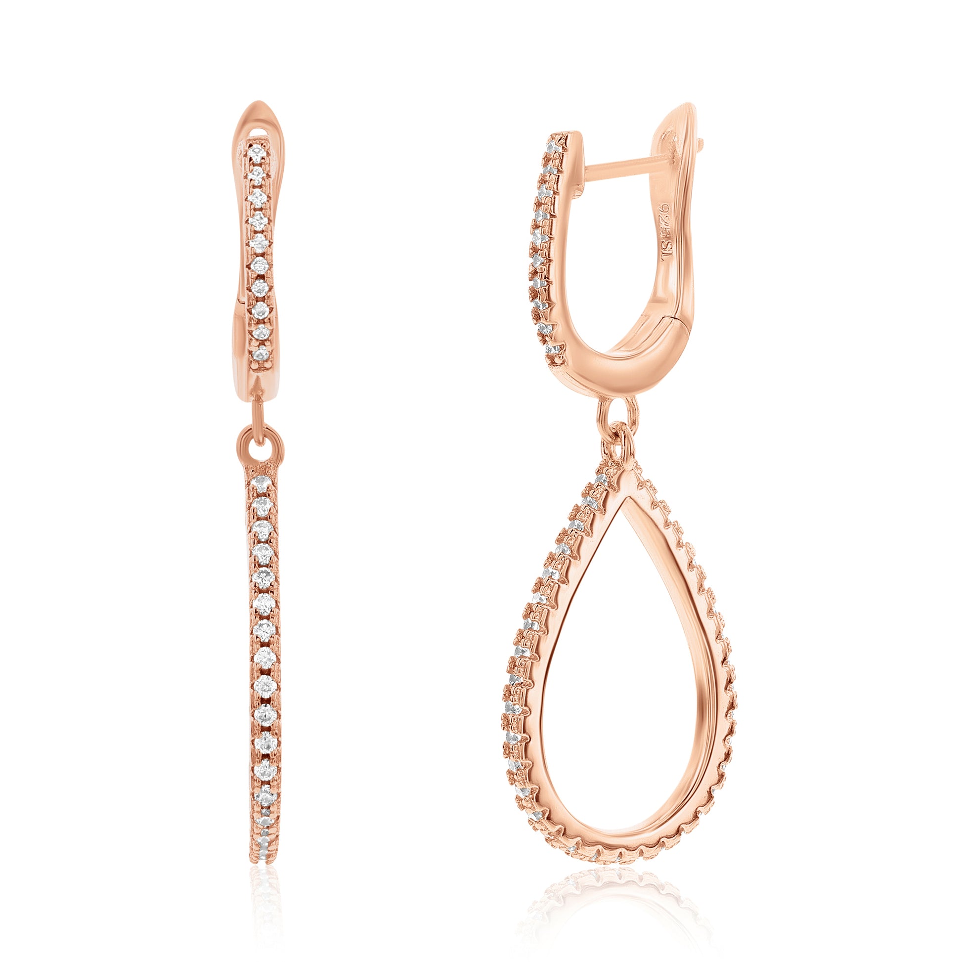 Add the perfect amount of sparkle to your ears with these pear shape drop white cubic zirconia earrings! These beautiful earrings features pave set white cubic zirconia in a unique diagonal open pear shape design. These earrings will hang on your ears and will create shimmer and shine from every angle. These gemstones are all hand set in 925 rose sterling silver with a high polish finish. Surprise someone special in your life with these luxurious earrings. The perfect gift that is not only strikingly gorgeous but also reminds your special someone that your love lasts forever. The Suzy Levian brand guarantees the finest craftsmanship and confirms that each and every item has been subjected to the most exacting quality control. As well as being designed through breathtaking details, these earrings are designed by Suzy Levian with a special message to share. By creating jewelry that is beautiful inside and out, 'Together we can inspire the world to appreciate the diamond in ourselves.' - S.L.