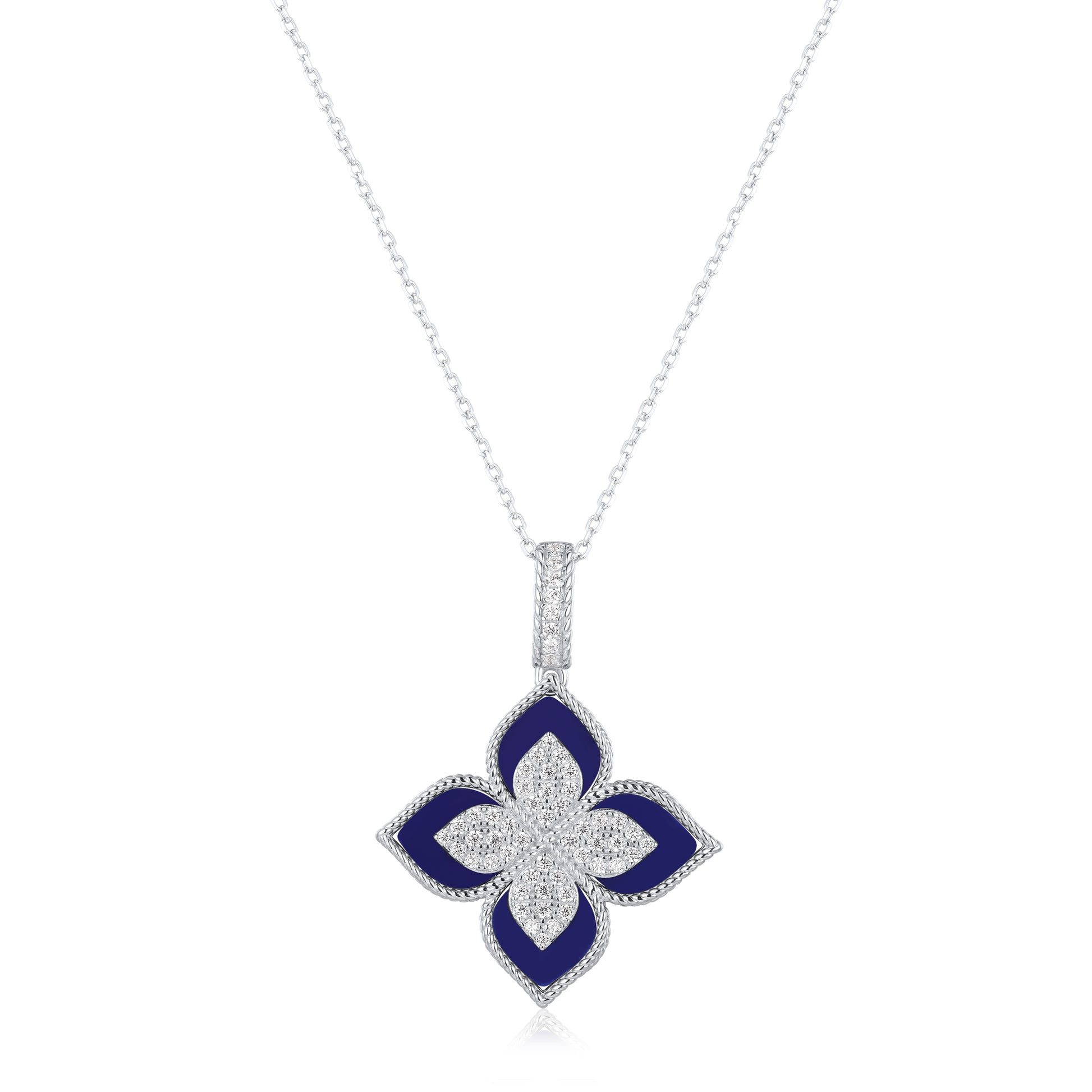 Suzy Levian Sterling Silver Blue Enamel White Cubic Zirconia Pave Flower Clover Pendant