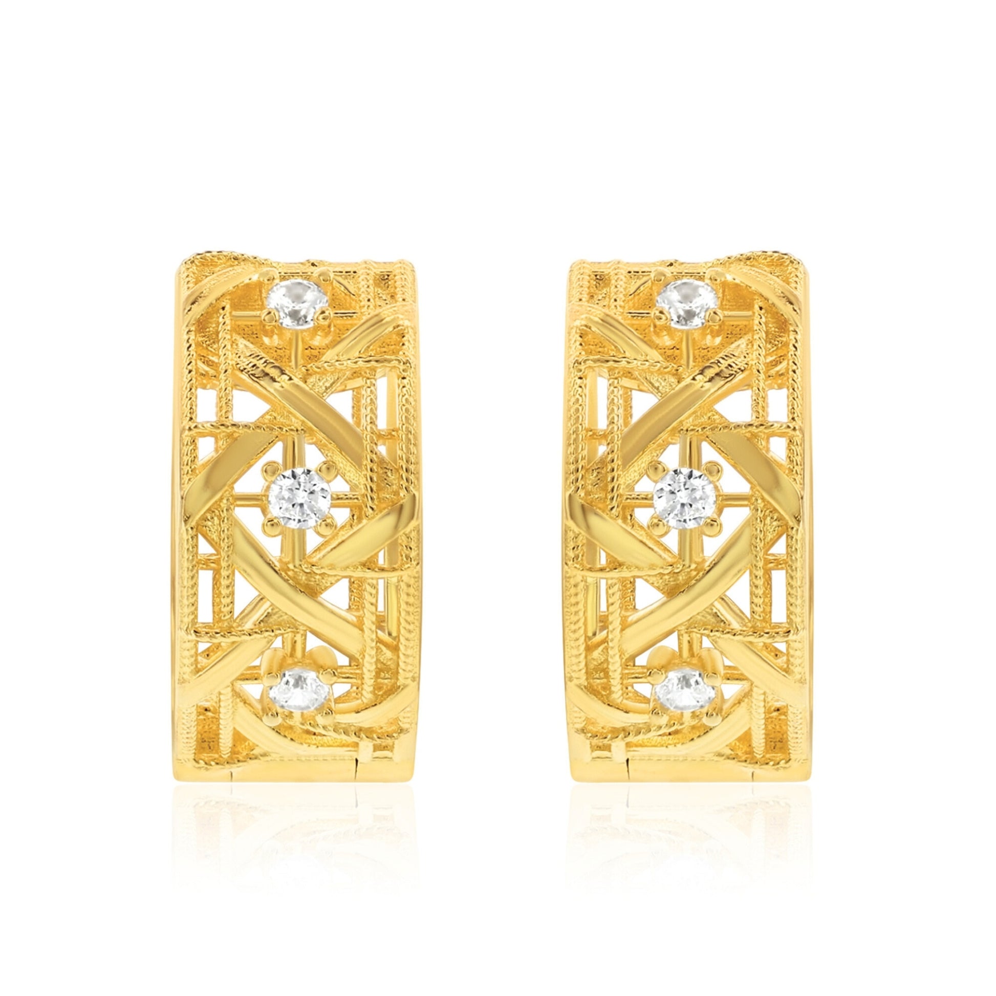Stunning cutout huggie hoops for women of all ages. These earrings features six round cut white cubic zirconia prong set, in a unique cutout yellow sterling silver setting, to give off shine from every angle. These huggie hoops will add sparkle and sophistication to your ensemble and is perfect for any occasion! These hoops contain a lever back closure keeping them secure and comfortable. The inside is finished with a open gallery and SL logo and secret stone representing the hidden inner beauty within us all!