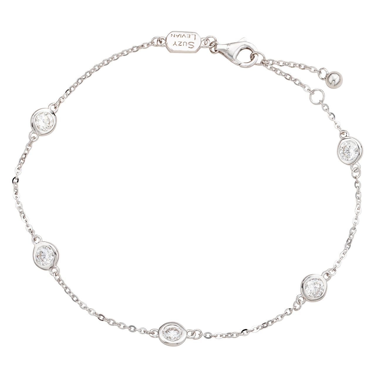 Add some sparkle to your wrist with this beautiful diamond station bracelet by Suzy Levian. This magnificent bracelet boasts 5 brilliant round-cut diamonds in an exquisite bezel adorned of 14-karat white gold. This bracelet features a high polish finish and secures with a spring ring clasp.