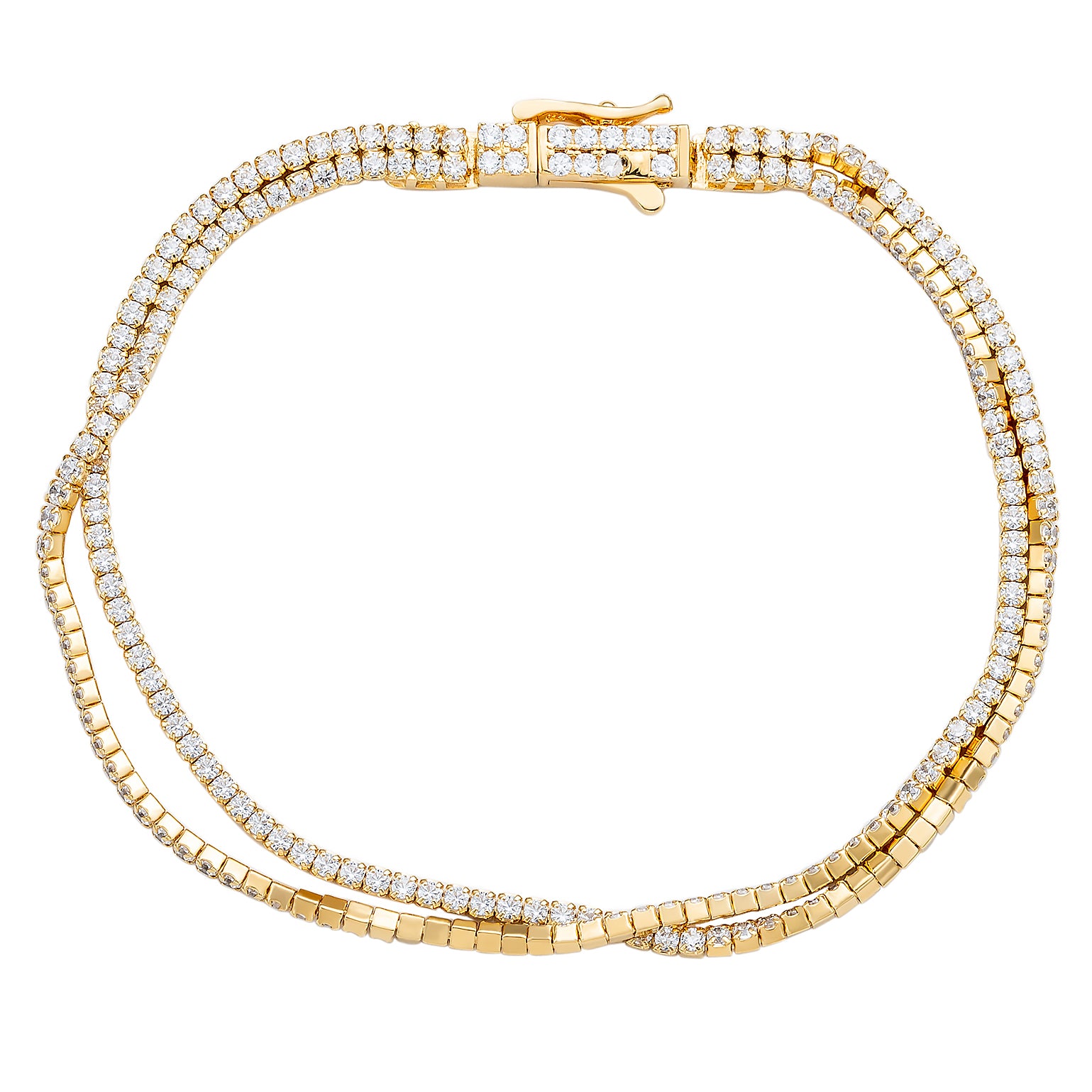 Embrace beauty in it's finest display. This gorgeous Suzy Levian bracelet is filled with round, pave, white cubic zirconia gemstones, creating 2 single bracelets that connect at the lock. Each individual bracelet is yellow sterling silver creating a 2 strand masterpiece. The separate bracelets give the illusion of three different bracelets without the headache of tangling and intertwining. A hidden lock keeps the bracelet securely locked on your hand in a fashionable manner. Each Suzy Levian creation is handcrafted of 925 sterling silver and high quality and carefully selected cubic zirconia, providing our customers with the finest accessories.