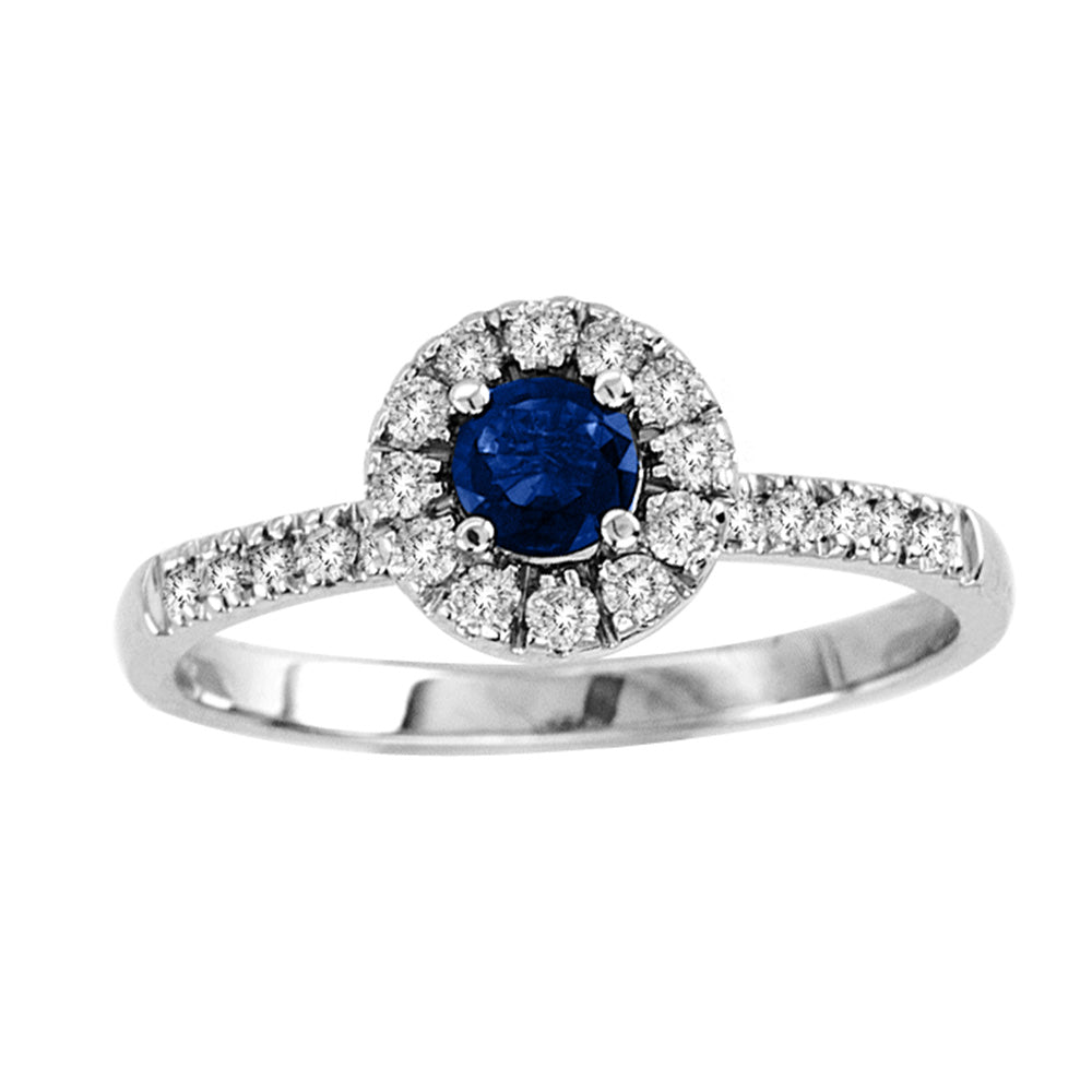 Enjoy sapphire hues with this petite bridal ring featuring a round cut blue sapphire center stone, surrounded by a white diamond pave-set halo continuing down the band of the ring. This beautiful ring is from Suzy Levian's latest collection, "Petite Perfects", designed for ladies who prefer a more slimmed, less bulky look, whether it's an extra accessory in the workplace or an addition pop of color to your night-time ensemble!