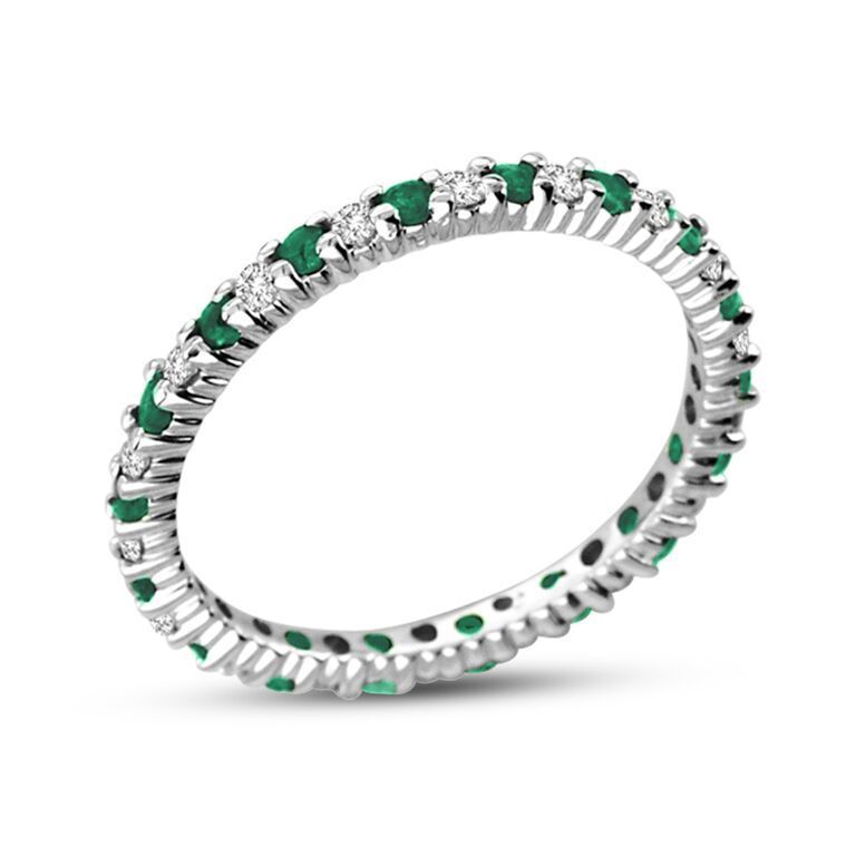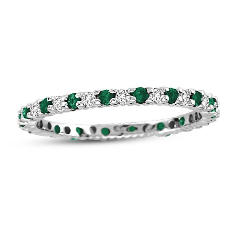 Show commitment to your loved one with this 14K White Gold Diamond and Emerald Eternity Band Ring. This ring packs an impressive amount of elegance into its sturdy prong settings. The low profile keeps your gems safe and prevents snagging on fabrics. Designed by Suzy Levian, this 14k white gold eternity ring features a high polish finish.