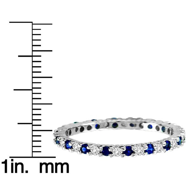 Radiant round-cut diamonds and sapphires sparkle along the entire band of this wedding band ring, lending dazzle to your reminder of commitment. Designed by Suzy Levian, this 14k white gold eternity ring features a high polish finish. Adorn your hand or the hand of a loved one with .25 carats total weight of diamonds, and .30 carats total weight of sapphire that come together in a glorious display of vibrancy. This ring is eye-catching on its own or can also set off your engagement ring. Remind yourself of your love and commitment every time you look at this elegant ring. This ring packs an impressive amount of elegance into its sturdy prong settings. The low profile keeps your gems safe and prevents snagging on fabrics. The most popular diamond cut for engagement rings, round-cut diamonds exceed all other cuts in brilliance and sparkle. White gold is often used to enhance diamonds and other gemstones. These diamonds have an H-I, I1-I2 quality which is the same diamond quality used by most high end jewelry designers. These diamonds and sapphires sit in a 14k gold setting. Jewelry Type: Fine