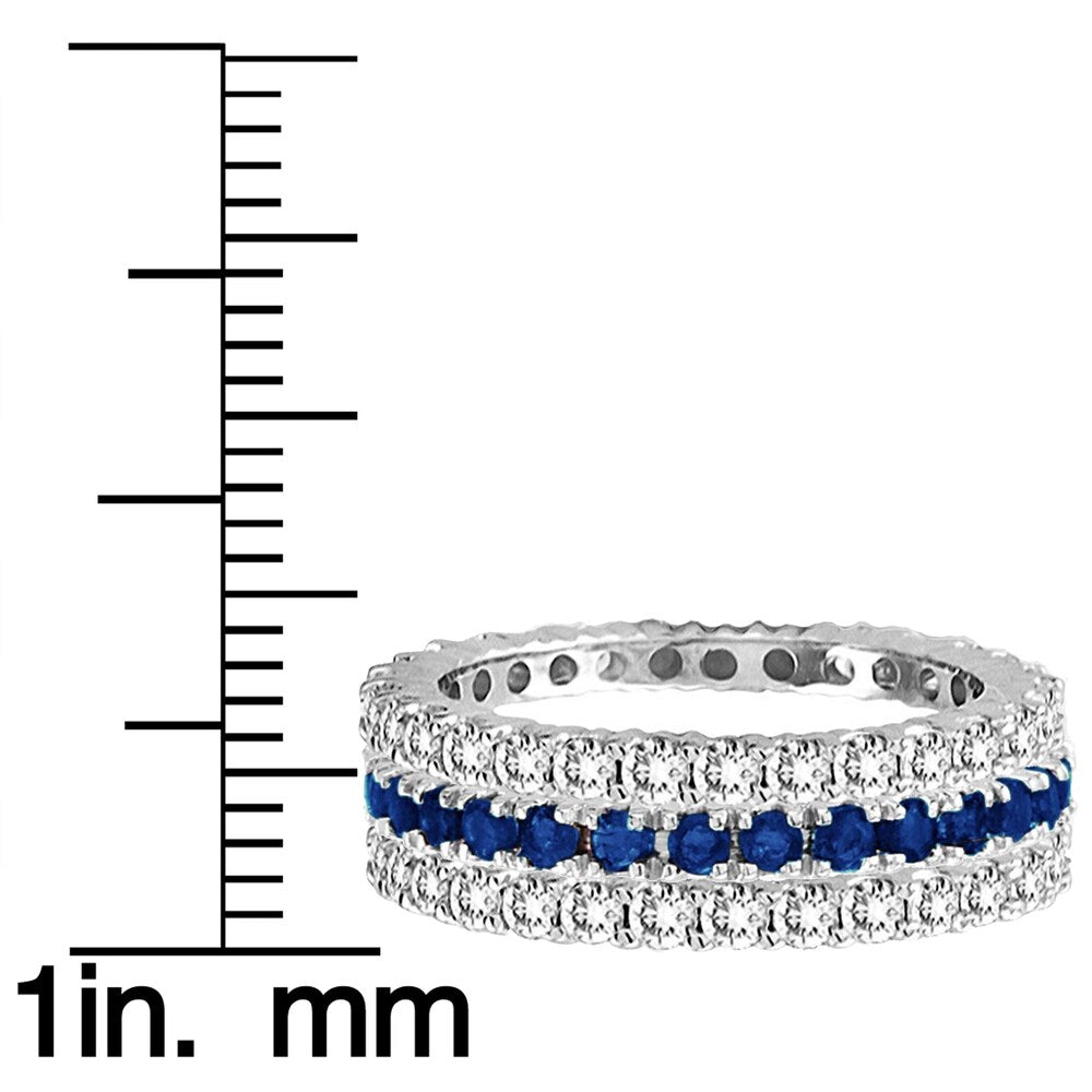 These classic stackable eternity band rings feature sparkling round-cut diamond and sapphire gemstones, designed by Suzy Levian. The finely crafted 14k white gold setting showcases a highly polished finished. These dazzling gemstones decorate these eternity band rings to add sparkle to your attire. Stackable and easy to wear, this high polish white gold plated ring is comes as a set of 3 individual thin rings that you can wear together or in different combinations to match your every look. This set comes with 2 diamond bands and one sapphire band. These rings have a thin and delicate design but when worn together they make a beautiful statement. These rings make great gifts for any occasion. The total diamond weight is .50 carats and the total gem weight is .80 carats. Remind yourself of your love and commitment every time you look at these elegant rings. These rings pack an impressive amount of elegance into its sturdy prong settings. The low profile keeps your gems safe and prevents snagging on fabrics. The most popular diamond cut for anniversary bands, round-cut diamonds exceed all other cuts in brilliance and sparkle. White gold is often used to enhance diamonds and other gemstones. Use these rings to fully flesh out your jewelry collection, allowing you to coordinate your accessories with any outfit. The unique, sophisticated style of the ring melds well with casual outfits, professional wear or date-night attire. These gemstones have vibrant colors and these diamonds have an H-I, I1-I2 quality which is the same diamond quality used my most high end jewelry designers. These diamonds sit in a 14k gold setting which is the same gold quality used by most high end jewelry designers. Jewelry Type: Fine